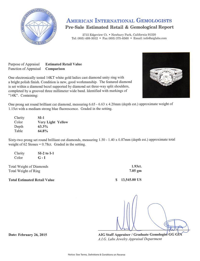 One electronically tested 14KT white gold ladies cast diamond unity ring with a bright polish finish. The featured diamond is set within a diamond bezel supported by diamond set three-way split shoulders, completed by a grooved three millimeter wide band. Identified with markings of "14K". Condition is new, good workmanship. Containing: One prong set round brilliant cut diamond, measuring 6.65 - 6.63 x 4.20mm (depth est.) approximate weight of 1.15ct with a medium strong blue fluorescence. Graded in the setting. Clarity: SI-1. Depth: 63.3%. Table 64.8%. Sixty-Two prong set round brilliant cut diamonds, measuring 1.50 - 1.40 x 0.87mm (depth est.) approximate total weight of 62 Stones = 0.78ct. Graded in the setting. Clarity: SI-2 to I-1. Color: G - I. Total Weight of Diamonds 1.93ct. Total Weight of Ring 7.05 grams. AIG Appraised at $13,545.00.