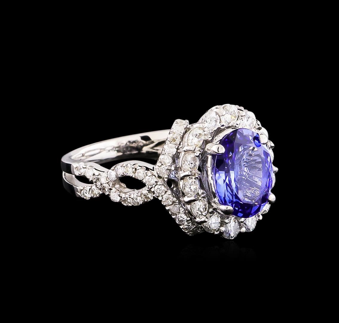 One electronically tested 14KT white gold Ladies combination cast & assembled ring with a bright polish finish. Condition is new. Identified with markings of "K14". Containing: One prong set oval modified brilliant cut natural tanzanite, measuring 9.50 x 7.80 x 3.84mm, approximate weight of 1.93ct., clarity is eye clean, type I, medium, moderately strong, bluish violet color, (GIA bV 5/4), cut is good. Colored gemstones are presumed to have been subjected to commonly used color/clarity enhancement processes. Sixty-Five prong set round brilliant cut diamonds, measuring 1.30 - 1.30 x 0.78mm (depth est.) approximate. Total Weight of 65 Stones = 0.52ct. Clarity: I-1 to I-2. Color: I - J, Cut is Good. Fourteen prong set round brilliant cut diamonds, measuring 2.50 - 2.50 x 1.50mm (depth est.) approximate. Total Weight of 14 Stones = 0.80ct. Clarity: SI-2 to I-1. Color: I - J, Cut is Good. Total Weight of Colored Stones 1.93ct. Total Weight of Diamonds 1.32ct. Total Weight of Ring 7.00 grams. GGL Appraised at $8,555.00.