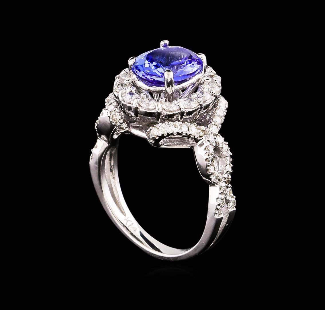 One electronically tested 14KT white gold Ladies combination cast & assembled ring with a bright polish finish. Condition is new. Identified with markings of "K14". Containing: One prong set oval modified brilliant cut natural tanzanite, measuring 9.50 x 7.80 x 3.84mm, approximate weight of 1.93ct., clarity is eye clean, type I, medium, moderately strong, bluish violet color, (GIA bV 5/4), cut is good. Colored gemstones are presumed to have been subjected to commonly used color/clarity enhancement processes. Sixty-Five prong set round brilliant cut diamonds, measuring 1.30 - 1.30 x 0.78mm (depth est.) approximate. Total Weight of 65 Stones = 0.52ct. Clarity: I-1 to I-2. Color: I - J, Cut is Good. Fourteen prong set round brilliant cut diamonds, measuring 2.50 - 2.50 x 1.50mm (depth est.) approximate. Total Weight of 14 Stones = 0.80ct. Clarity: SI-2 to I-1. Color: I - J, Cut is Good. Total Weight of Colored Stones 1.93ct. Total Weight of Diamonds 1.32ct. Total Weight of Ring 7.00 grams. GGL Appraised at $8,555.00.