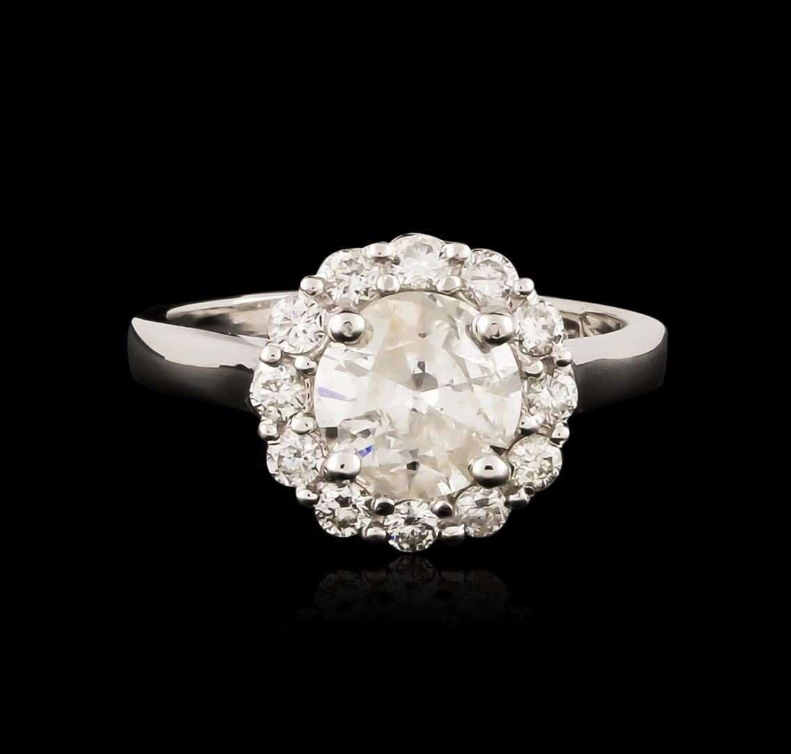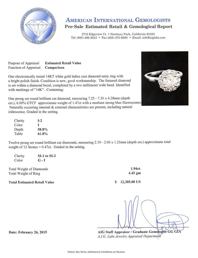 One electronically tested 14KT white gold ladies cast diamond unity ring with a bright polish finish. The featured diamond is set within a diamond bezel, completed by a two millimeter wide band. Identified with markings of "14K". Condition is new, good workmanship. Containing: One prong set round brilliant cut diamond, measuring 7.25 - 7.30 x 4.28mm (depth est.), 6.00.% GTCF approximate weight of 1.47ct with a medium strong blue fluorescence. Naturally occurring internal & external characteristics are present, including natural iridescence. Graded in the setting. Clarity: I-2. Color: I. Depth 58.8%. Table 61.8%. Twelve prong set round brilliant cut diamonds, measuring 2.10 - 2.00 x 1.23mm (depth est.) approximate total weight of 12 Stones = 0.47ct. Graded in the setting. Clarity: SI-1 to SI-2. Color: G - I. Total Weight of Diamonds 1.94ct. Total Weight of Ring 4.45 grams. AIG Appraised at $12,305.00.