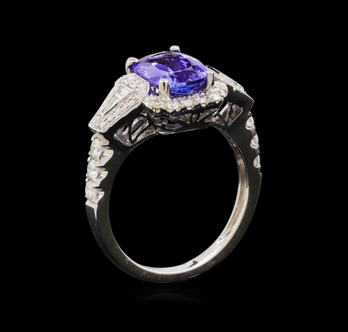 One electronically tested 14KT white gold ladies cast tanzanite & diamond ring with a bright finish. The featured tanzanite is set within a diamond bezel, supported by tapering diamond set shoulders, completed by a two millimeter wide band. Trademark is UCG. Identified with markings of "14K 585". Condition is good. Containing: One prong set rectangular cushion mixed cut natural tanzanite, measuring 8.80 x 6.80 x 4.00mm, 3% bulge factor, exact weight 1.94ct., clarity is eye clean, type I, medium dark, slightly grayish, bluish violet color, (GIA bV 6/2), cut is good. Transmitting light with no distortion, transparent. Graded in the setting. Tanzanite is a very rare gemstone that is only found in the country of Tanzania. Originally discovered in 1967. It is found in the Usumburu Mountains that border the Umba Valley of northern Tanzania. Tanzanite occurs in gray, brown, violet, blue, reddish-purple, & green. The gem is interesting because of its exceptional pleochroism. Rotated in different directions a tanzanite will exhibit multiple changes of color. Tanzanite has a low tolerance to ultrasonic cleaning, and should not be cleaned using this method. Four channel set baguette cut (tapered) diamonds, measuring from 2.30 x 1.30 x 0.88mm (depth est.) to 2.40 x 1.75 x 1.19mm (depth est.) approximate total weight of 4 Stones = 0.14ct. Graded in the setting. Clarity: VS-2 to SI-1. Color: G - H Eighteen prong set round brilliant cut diamonds, measuring 2.30 - 1.55 x 1.16mm (depth est.) approximate total weight of 18 Stones = 0.44ct. Graded in the setting. Clarity: SI-2 to I-1. Color: G - H Thirty-Two prong set round brilliant cut diamonds, measuring 0.90 - 0.80 x 0.51mm (depth est.) approximate total weight of 32 Stones = 0.08ct. Graded in the setting. Clarity: SI-2 to I-1. Color: G - I. Total Weight of Colored Stones 1.94ct. Total Weight of Diamonds 0.66ct. Total Weight of Ring 5.07 grams. AIG Appraised at $6,050.00.