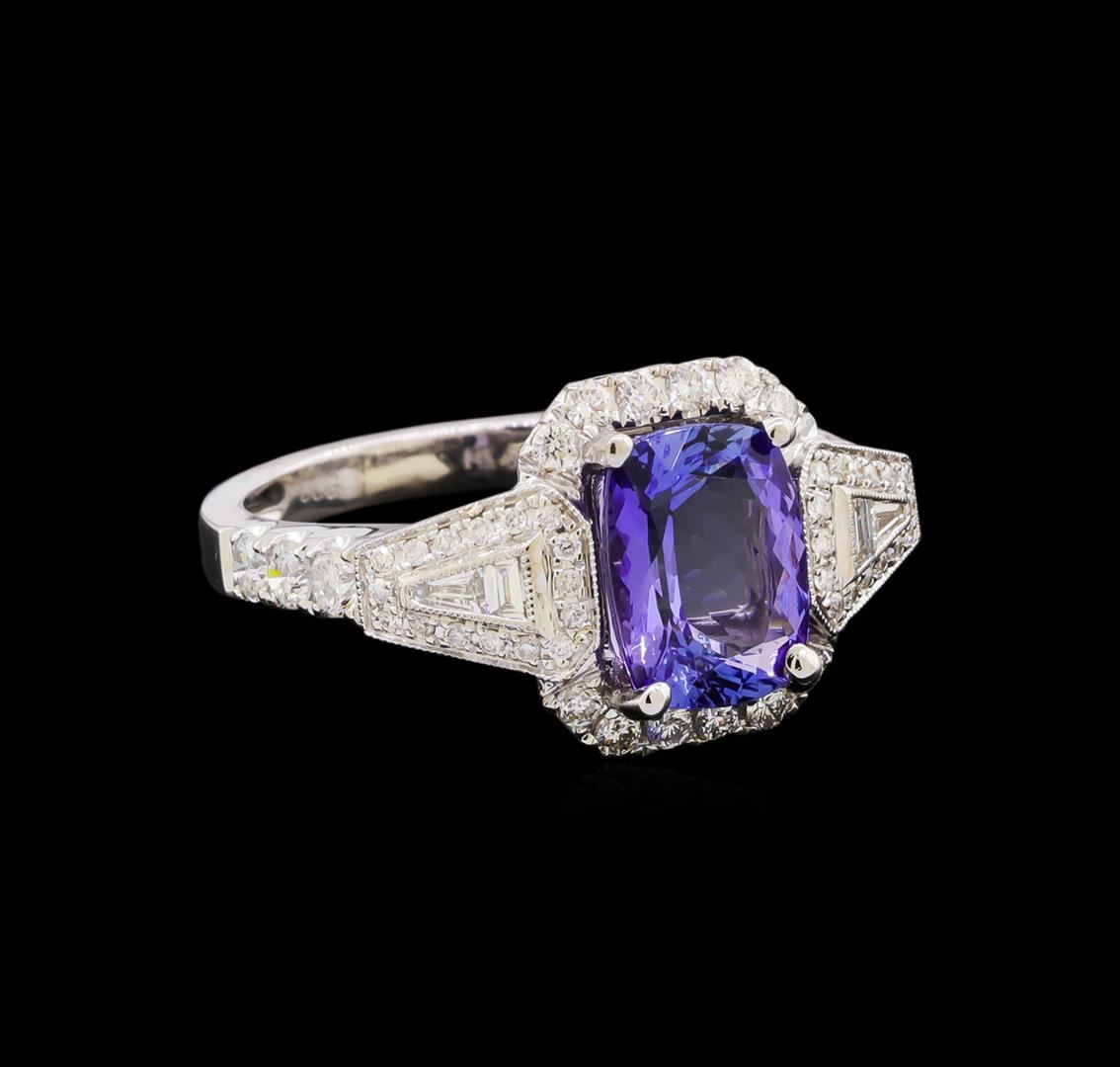 One electronically tested 14KT white gold ladies cast tanzanite & diamond ring with a bright finish. The featured tanzanite is set within a diamond bezel, supported by tapering diamond set shoulders, completed by a two millimeter wide band. Trademark is UCG. Identified with markings of "14K 585". Condition is good. Containing: One prong set rectangular cushion mixed cut natural tanzanite, measuring 8.80 x 6.80 x 4.00mm, 3% bulge factor, exact weight 1.94ct., clarity is eye clean, type I, medium dark, slightly grayish, bluish violet color, (GIA bV 6/2), cut is good. Transmitting light with no distortion, transparent. Graded in the setting. Tanzanite is a very rare gemstone that is only found in the country of Tanzania. Originally discovered in 1967. It is found in the Usumburu Mountains that border the Umba Valley of northern Tanzania. Tanzanite occurs in gray, brown, violet, blue, reddish-purple, & green. The gem is interesting because of its exceptional pleochroism. Rotated in different directions a tanzanite will exhibit multiple changes of color. Tanzanite has a low tolerance to ultrasonic cleaning, and should not be cleaned using this method. Four channel set baguette cut (tapered) diamonds, measuring from 2.30 x 1.30 x 0.88mm (depth est.) to 2.40 x 1.75 x 1.19mm (depth est.) approximate total weight of 4 Stones = 0.14ct. Graded in the setting. Clarity: VS-2 to SI-1. Color: G - H Eighteen prong set round brilliant cut diamonds, measuring 2.30 - 1.55 x 1.16mm (depth est.) approximate total weight of 18 Stones = 0.44ct. Graded in the setting. Clarity: SI-2 to I-1. Color: G - H Thirty-Two prong set round brilliant cut diamonds, measuring 0.90 - 0.80 x 0.51mm (depth est.) approximate total weight of 32 Stones = 0.08ct. Graded in the setting. Clarity: SI-2 to I-1. Color: G - I. Total Weight of Colored Stones 1.94ct. Total Weight of Diamonds 0.66ct. Total Weight of Ring 5.07 grams. AIG Appraised at $6,050.00.