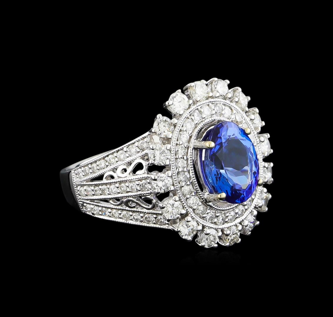 One electronically tested 14KT white gold ladies combination cast & assembled tanzanite and diamond ring with a split shank with a bright polish finish. Identified with markings of "14K". Condition is new. Containing: One prong set oval modified brilliant cut natural tanzanite, measuring 8.91 x 6.92 x 4.65mm, approximate weight of 1.95ct., clarity is eye clean, type I, medium, moderately strong, violet color, (GIA V 5/4), cut is good. Sixteen prong set round brilliant cut diamonds, measuring 2.10 - 2.10 x 1.26mm (depth est.) approximate total weight of 16 Stones = 0.54ct. Clarity: SI-1 to SI-2. Color: I - J, Cut is Good. Seventy-Two prong set round brilliant cut diamonds, measuring 1.10 - 1.10 x 0.66mm (depth est.) approximate total weight of 72 Stones = 0.35ct. Clarity: SI-2 to I-2. Color: I - J, Cut is Good. Colored gemstones are presumed to have been subjected to commonly used enhancement processes. All diamonds and colored gemstones are graded in the mounting, unless otherwise stated. Total Weight of Colored Stones 1.95ct. Total Weight of Diamonds 0.89ct. Total Weight of Ring 5.80 grams. GGL Appraised at $6,975.00.