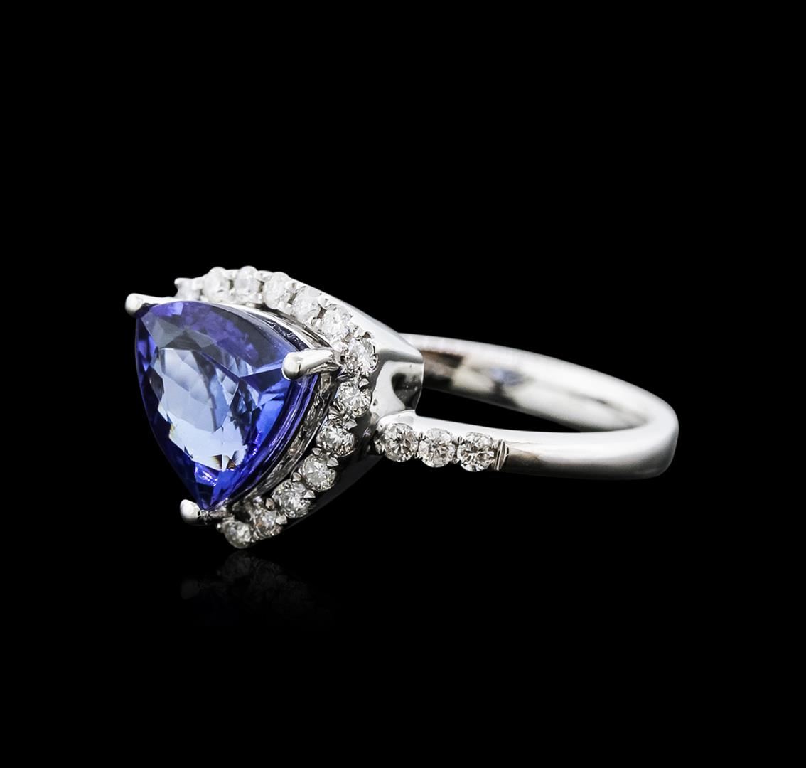 One electronically tested 14KT white gold ladies cast tanzanite and diamond ring with a flat shank with rounded edges with a bright polish finish. Trademark is Orianne. Identified with markings of "14K". Condition is new. Containing: One prong set triangle modified brilliant cut natural tanzanite, measuring 7.92 x 7.96 x 5.13mm, approximate weight of 1.95ct., clarity is eye clean, type I, medium light, moderately strong, violetish blue color, (GIA vB 4/4), cut is good. Twenty-Four prong set round brilliant cut diamonds, measuring 1.30 - 1.30 x 0.78mm (depth est.) approximate total weight of 24 Stones = 0.38ct. Clarity: SI-2 to I-2. Color: I - J, Cut is Good. All diamonds and colored gemstones are graded in the mounting, unless otherwise stated. Colored gemstones are presumed to have been subjected to commonly used enhancement processes.. Total Weight of Colored Stones 1.95ct. Total Weight of Diamonds 0.38ct. Total Weight of Ring 4.30 grams. GGL Appraised at $3,735.00.