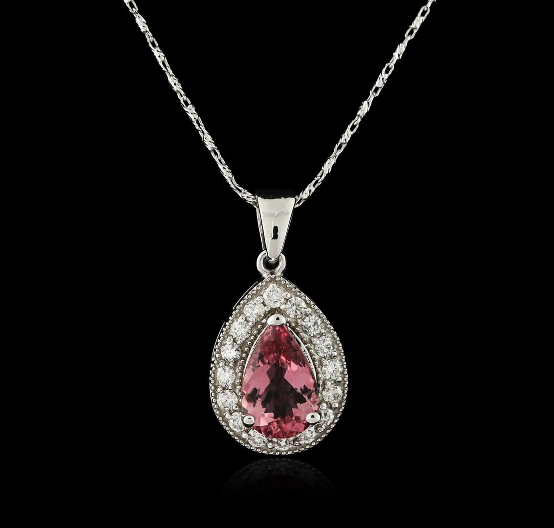 One electronically tested 14KT white gold ladies cast tourmaline and diamond pendant & chain 18.0" long, with a lobster claw clasp with a bright polish finish. Identified with markings of "14K". Condition is new. Containing: Seventeen prong set round brilliant cut diamonds, measuring 2.00 - 2.00 x 1.20mm (depth est.) approximate total weight of 17 Stones = 0.50ct. Clarity: SI-1 to I-1. Color: H - I, Cut is Good. Diamonds and colored gemstones are graded in the mounting, unless otherwise stated. Colored gemstones are presumed to have been subjected to commonly used enhancement processes. One prong set pear modified brilliant cut natural pink tourmaline, measuring 10.00 x 7.00 x 4.55mm, approximate weight of 1.95ct., clarity is eye clean, type II, medium light, slightly grayish, reddish purple color, (GIA rP 4/2), cut is good. Total Weight of Colored Stones 1.95ct. Total Weight of Diamonds 0.50ct. Total Weight of Pendant & Chain 5.40 grams. GGL Appraised at $1,960.00.