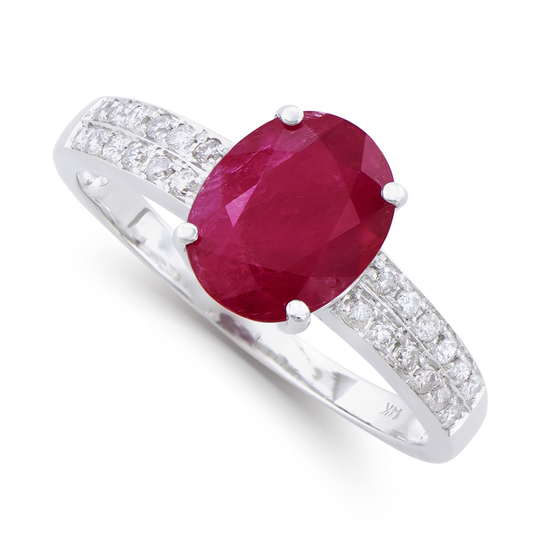 One 14KT White Gold 1.92ct Ruby and Diamond Ring. (1) Ruby with a total weight of 1.95cts. Diamonds with a total weight of 0.18cts with a color of H-I and clarity of I-1 to I-2. Total weight of this ring is 2.6 grams. Ring size is 7.5.