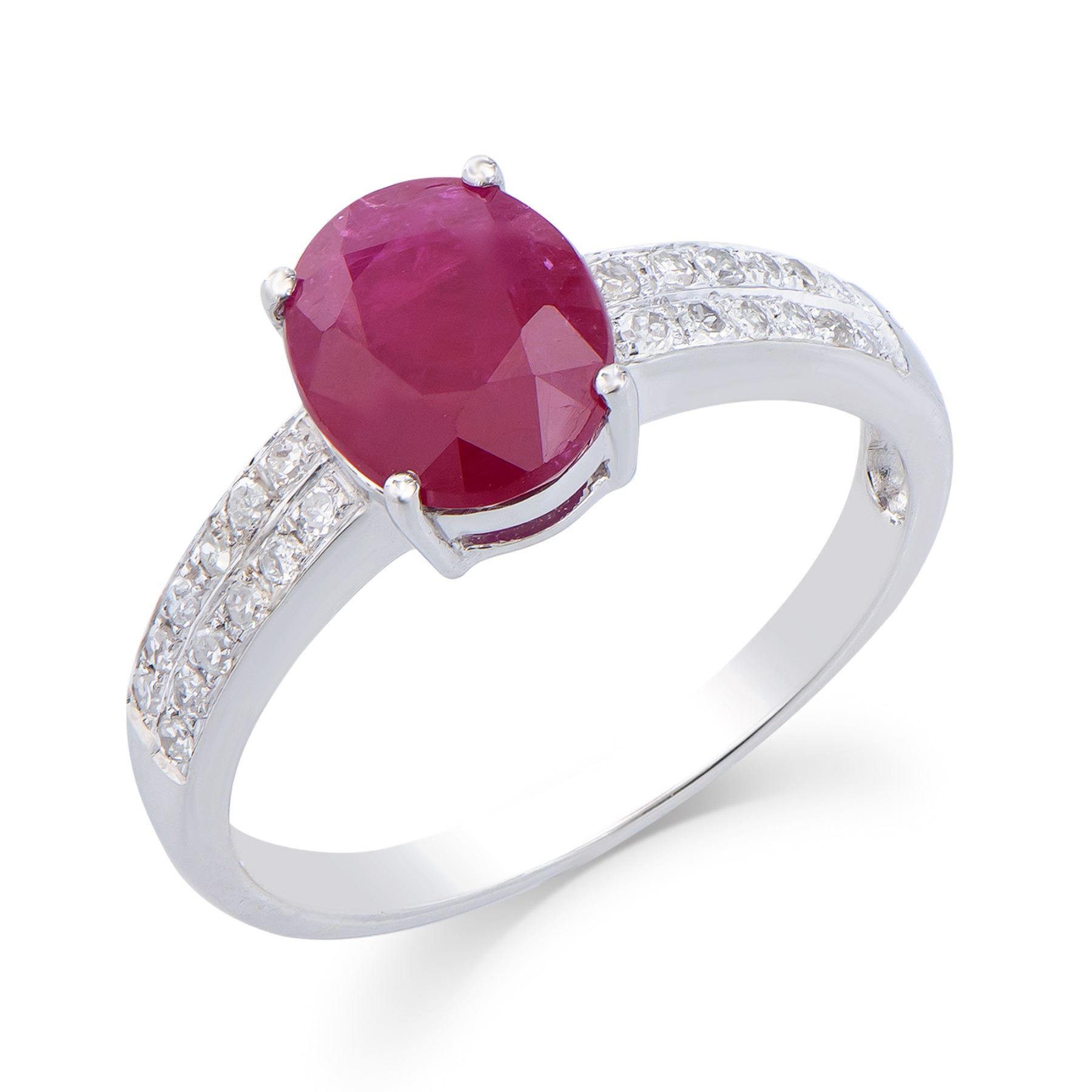 One 14KT White Gold 1.92ct Ruby and Diamond Ring. (1) Ruby with a total weight of 1.95cts. Diamonds with a total weight of 0.18cts with a color of H-I and clarity of I-1 to I-2. Total weight of this ring is 2.6 grams. Ring size is 7.5.