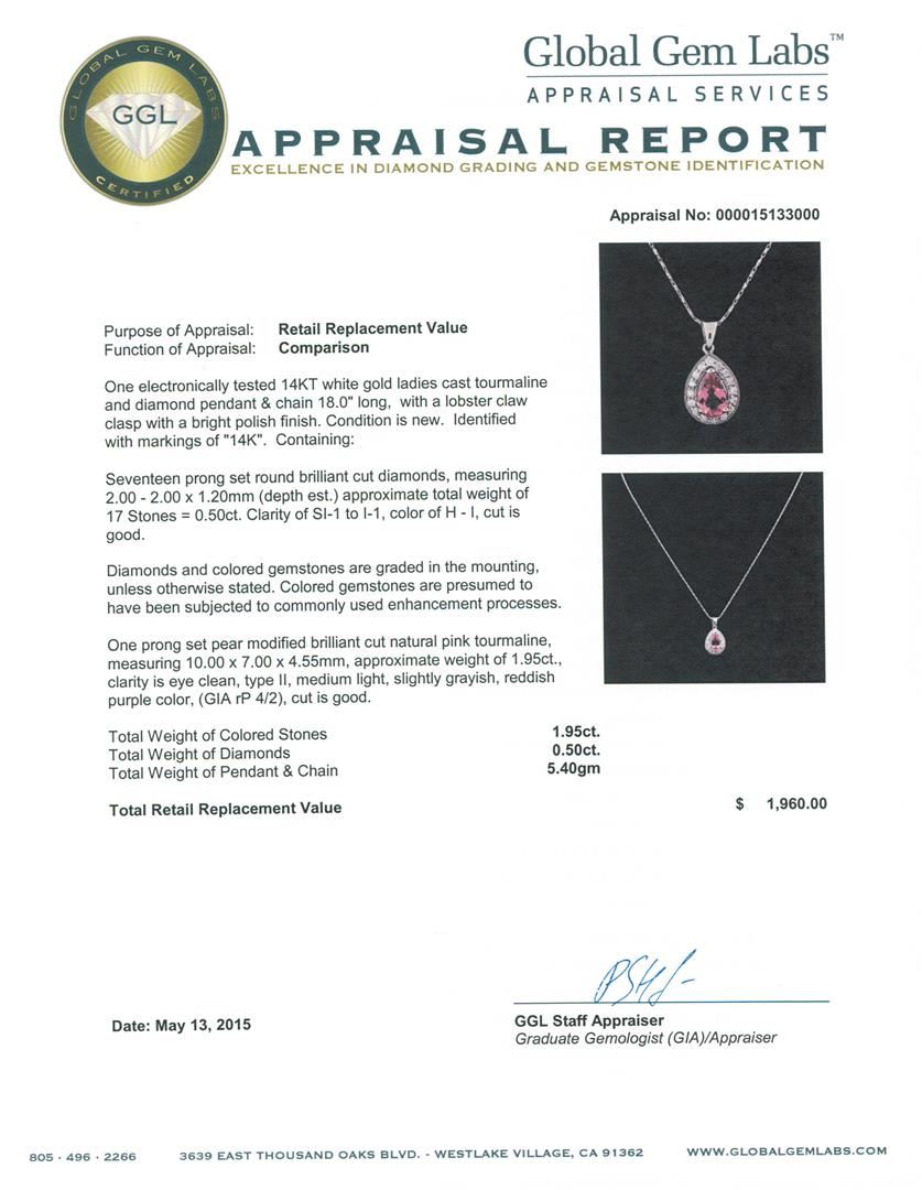One electronically tested 14KT white gold ladies cast tourmaline and diamond pendant & chain 18.0" long, with a lobster claw clasp with a bright polish finish. Identified with markings of "14K". Condition is new. Containing: Seventeen prong set round brilliant cut diamonds, measuring 2.00 - 2.00 x 1.20mm (depth est.) approximate total weight of 17 Stones = 0.50ct. Clarity: SI-1 to I-1. Color: H - I, Cut is Good. Diamonds and colored gemstones are graded in the mounting, unless otherwise stated. Colored gemstones are presumed to have been subjected to commonly used enhancement processes. One prong set pear modified brilliant cut natural pink tourmaline, measuring 10.00 x 7.00 x 4.55mm, approximate weight of 1.95ct., clarity is eye clean, type II, medium light, slightly grayish, reddish purple color, (GIA rP 4/2), cut is good. Total Weight of Colored Stones 1.95ct. Total Weight of Diamonds 0.50ct. Total Weight of Pendant & Chain 5.40 grams. GGL Appraised at $1,960.00.