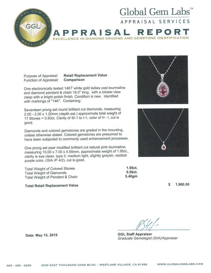 One electronically tested 14KT white gold ladies cast tourmaline and diamond pendant & chain 18.0" long, with a lobster claw clasp with a bright polish finish. Identified with markings of "14K". Condition is new. Containing: Seventeen prong set round brilliant cut diamonds, measuring 2.00 - 2.00 x 1.20mm (depth est.) approximate total weight of 17 Stones = 0.50ct. Clarity: SI-1 to I-1. Color: H - I, Cut is Good. Diamonds and colored gemstones are graded in the mounting, unless otherwise stated. Colored gemstones are presumed to have been subjected to commonly used enhancement processes. One prong set pear modified brilliant cut natural pink tourmaline, measuring 10.00 x 7.00 x 4.55mm, approximate weight of 1.95ct., clarity is eye clean, type II, medium light, slightly grayish, reddish purple color, (GIA rP 4/2), cut is good. Total Weight of Colored Stones 1.95ct. Total Weight of Diamonds 0.50ct. Total Weight of Pendant & Chain 5.40 grams. GGL Appraised at $1,960.00.