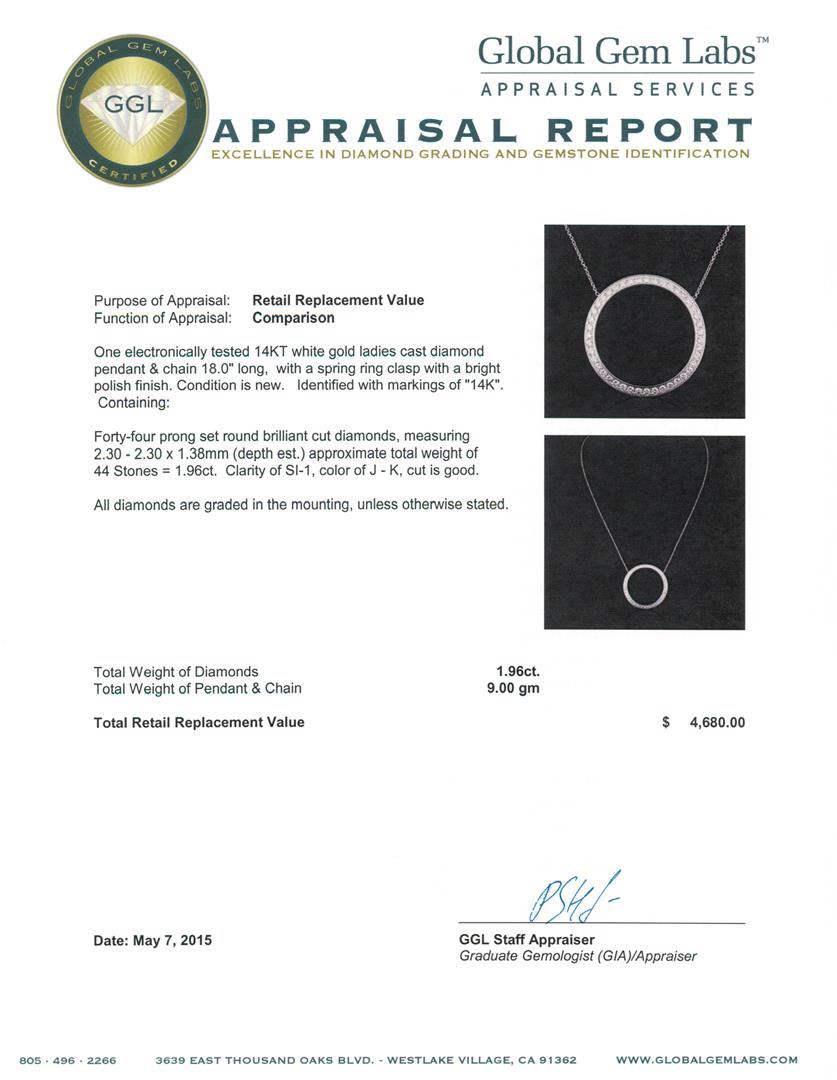 One electronically tested 14KT white gold ladies cast diamond pendant & chain 18.0" long, with a spring ring clasp with a bright polish finish. Identified with markings of "14K". Condition is new. Containing: Forty-Four prong set round brilliant cut diamonds, measuring 2.30 - 2.30 x 1.38mm (depth est.) approximate total weight of 44 Stones = 1.96ct. Clarity: SI-1. Color: J - K, Cut is Good. All diamonds are graded in the mounting, unless otherwise stated. Total Weight of Diamonds 1.96ct. Total Weight of Pendant & Chain 9.00 grams. GGL Appraised at $4,680.00.
