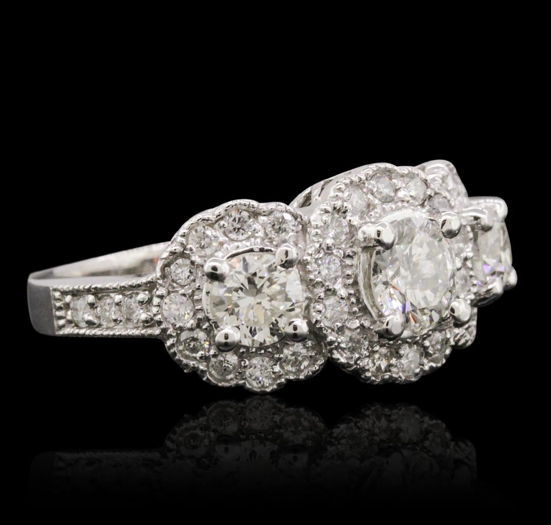 One electronically tested 14KT white gold ladies cast diamond ring. Condition is new, good workmanship. The ring features a trio of diamonds set within diamond set floral bezel supported by diamond set shoulders, completed by a two and one-half millimeter wide band. Bright polish finish with milgrain detailing. Identified with markings of "K14". Containing: One prong set round brilliant cut diamond, measuring 5.50 - 5.45 x 3.40mm (depth est.) approximate weight of 0.65ct. Graded in the setting. Clarity: I-1. Color: J Two prong set round brilliant cut diamonds, measuring 4.50 - 4.45 x 2.69mm (depth est.) approximate. Total Weight of 2 Stones = 0.70ct. Color & clarity grade are an average for the pair. Graded in the setting. Clarity: SI-2. Color: J Thirty-Eight prong set round brilliant cut diamonds, measuring 1.60 - 1.50 x 0.93mm (depth est.) approximate. Total Weight of 38 Stones = 0.61ct. Graded in the setting. Clarity: SI-2 to I-2. Color: G - I. Total Weight of Diamonds 1.96ct. Total Weight of Ring 6.35gm. AIG Appraised at $9,750.00.