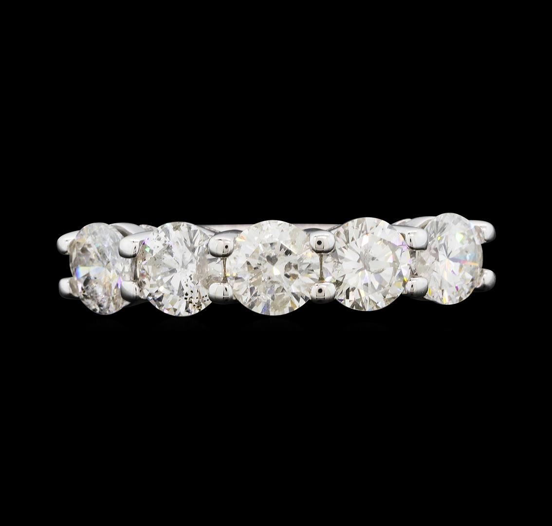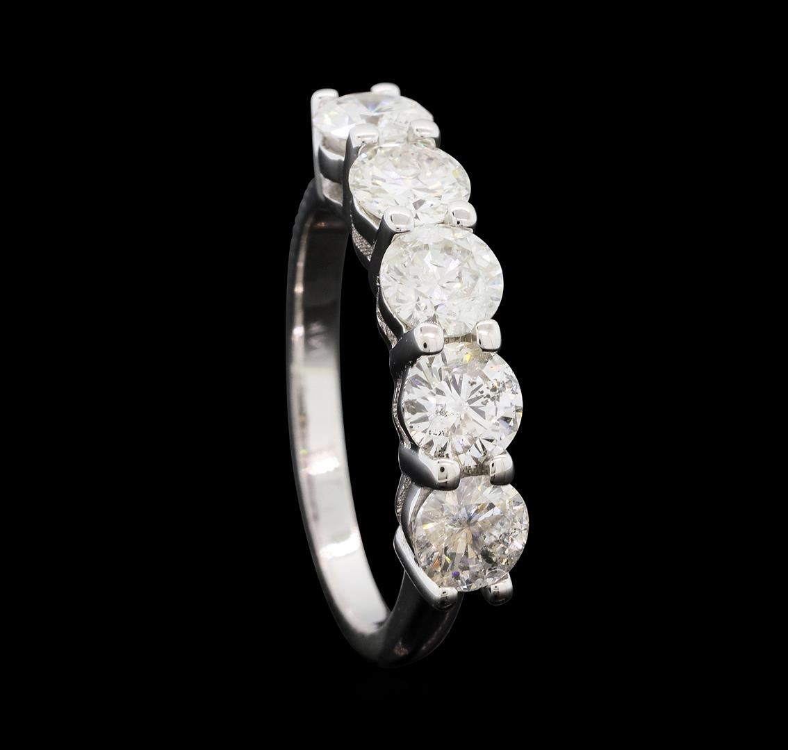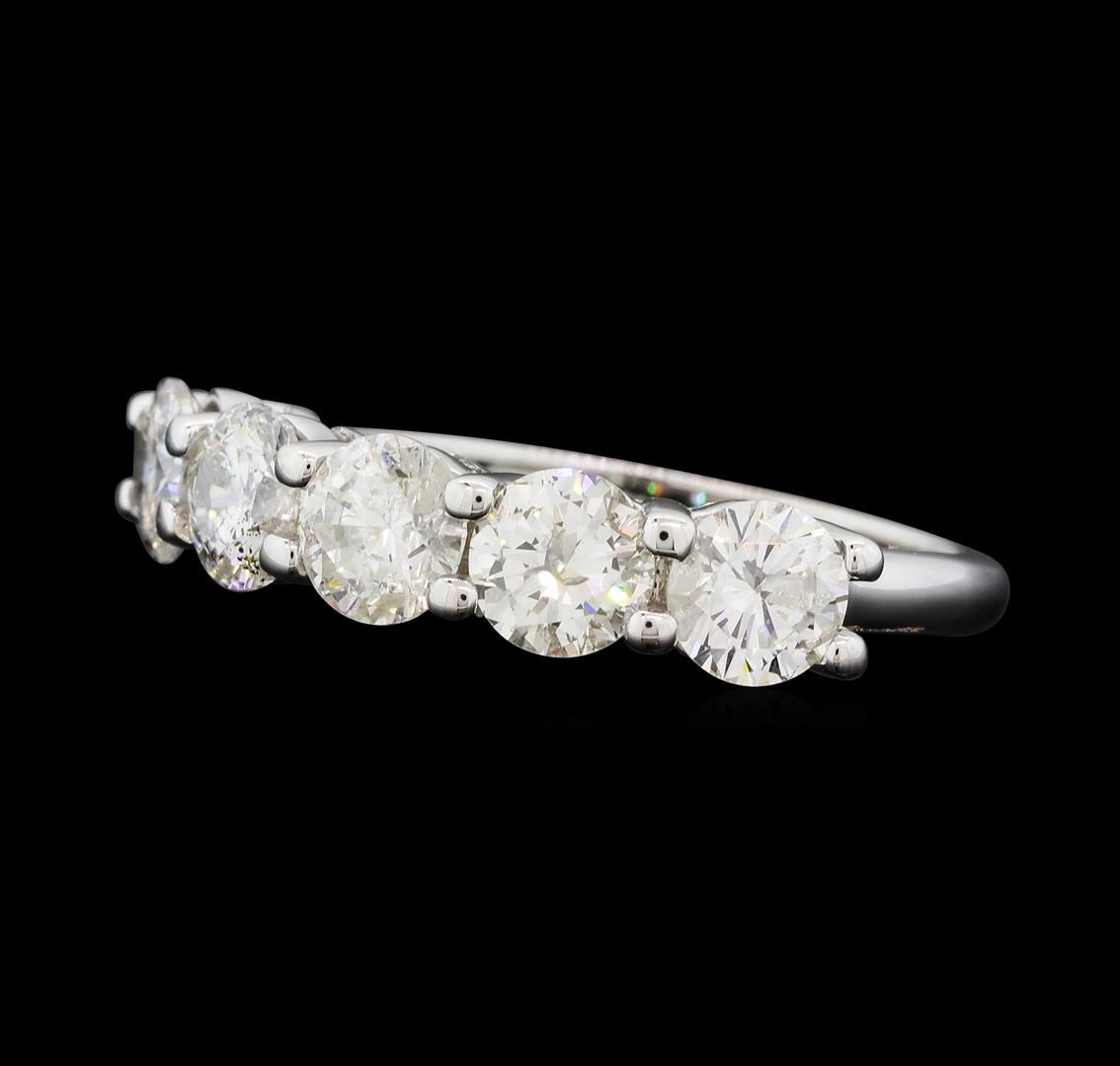 One electronically tested 14KT white gold lady's cast wedding ring with a straight line five stone motif with a bright polish finish. The featured lady's ring has a shank measuring 1.97 millimeters wide. Identified with markings of "14K". Condition is new, good workmanship. Containing: Five prong set round brilliant cut diamonds, measuring 4.78 - 4.65 x 2.88mm (depth est.) approximate. Total Weight of 5 Stones = 1.96ct. Graded in the setting. Color H - I Clarity I-1 Cut Good. Total Weight of Diamonds 1.96ct.. Total Weight of Ring 3.70gm. GAS Appraised.