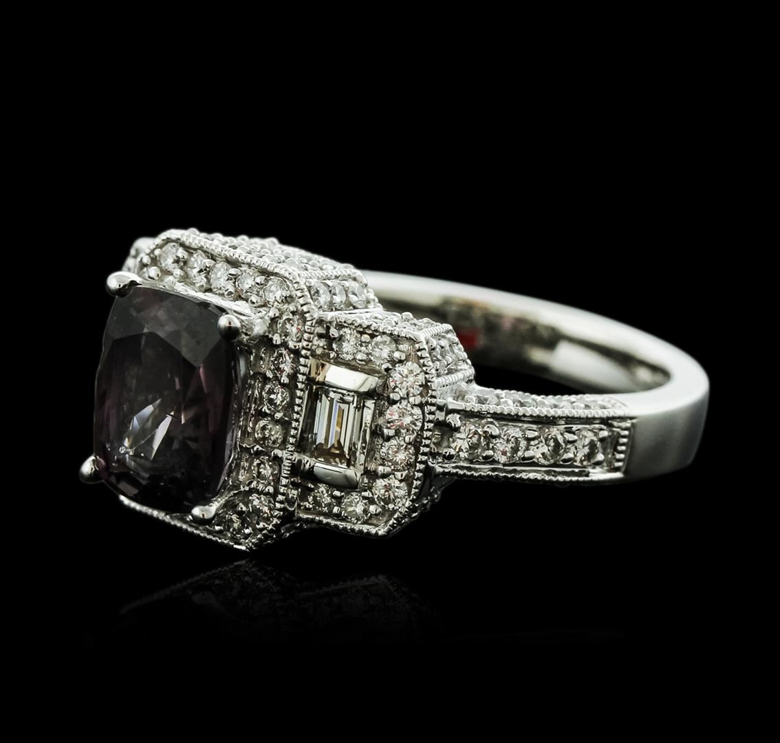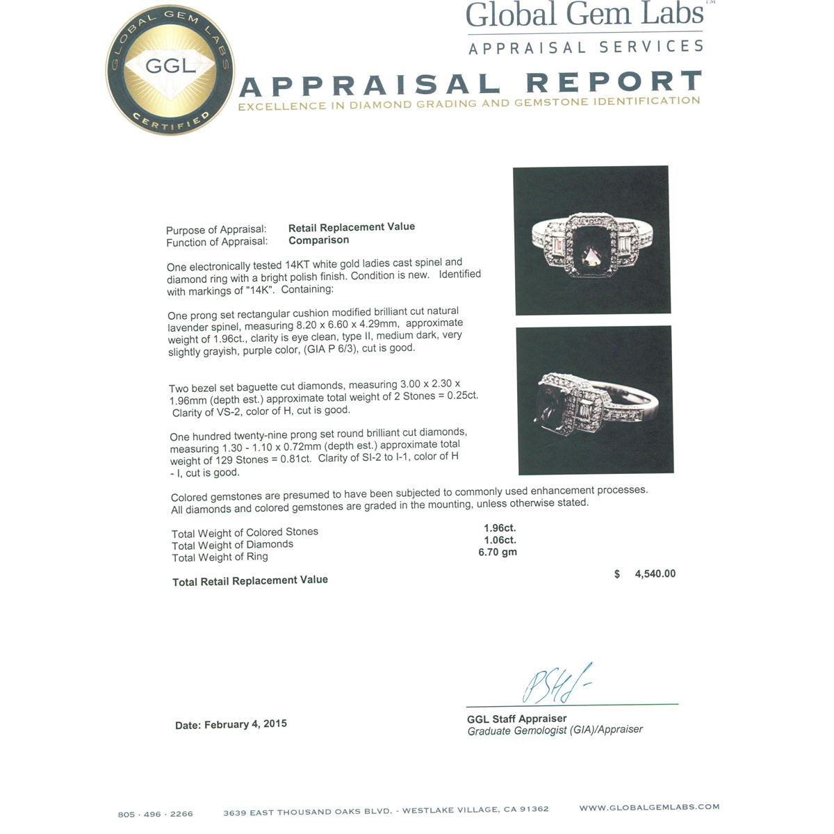 One electronically tested 14KT white gold ladies cast spinel and diamond ring with a bright polish finish. Identified with markings of "14K". Condition is new. Containing: One prong set rectangular cushion modified brilliant cut natural lavender spinel, measuring 8.20 x 6.60 x 4.29mm, approximate weight of 1.96ct., clarity is eye clean, type II, medium dark, very slightly grayish, purple color, (GIA P 6/3), cut is good. Two bezel set baguette cut diamonds, measuring 3.00 x 2.30 x 1.96mm (depth est.) approximate total weight of 2 Stones = 0.25ct. Clarity: VS-2. Color: H, Cut is Good. One Hundred Twenty-Nine prong set round brilliant cut diamonds, measuring 1.30 - 1.10 x 0.72mm (depth est.) approximate total weight of 129 Stones = 0.81ct. Clarity: SI-2 to I-1. Color: H - I, Cut is Good. Colored gemstones are presumed to have been subjected to commonly used enhancement processes. All diamonds and colored gemstones are graded in the mounting, unless otherwise stated. Total Weight of Colored Stones 1.96ct. Total Weight of Diamonds 1.06ct. Total Weight of Ring 6.70 grams. GGL Appraised at $4,540.00.