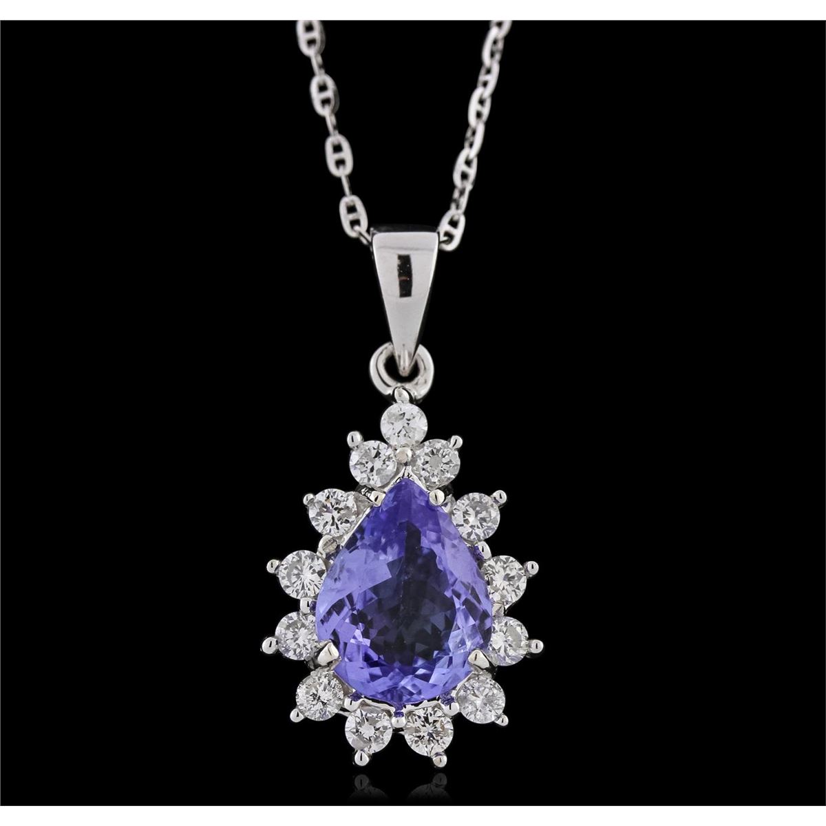 One electronically tested 14KT white gold ladies cast & assembled tanzanite and diamond pendant with chain. The pendant features a tanzanite set within a diamond bezel, completed by a white gold bail. The pendant is supported by an eighteen inch length 14KT white gold designer style chain, terminating in a spring ring clasp. Bright polish finish. Trademark is Orianne. Identified with markings of "14K". Condition is new, good workmanship. Containing: One prong set pear brilliant cut natural tanzanite, measuring 9.70 x 7.50 x 3.80mm, 6% bulge factor, approximate weight of 1.96ct., clarity is eye clean, type I, medium dark, very slightly grayish, bluish violet color, (GIA bV 6/3), cut is good. Transmitting light with no distortion, transparent. Graded in the setting. Tanzanite is a very rare gemstone that is only found in the country of Tanzania. Originally discovered in 1967. Tiffany & Company, named the stone Tanzanite. It is found in the Usumburu Mountains that border the Umba Valley of northern Tanzania. Tanzanite occurs in gray, brown, violet, blue, reddish-purple, & green. The gem is interesting because of its exceptional pleochroism. Rotated in different directions a tanzanite will exhibit multiple changes of color. Tanzanite has a low tolerance to ultrasonic cleaning, and should not be cleaned using this method. Thirteen prong set round brilliant cut diamonds, measuring 2.30 - 2.20 x 1.35mm (depth est.) approximate total weight of 13 Stones = 0.64ct. Graded in the setting. Clarity: SI-1 to I-1. Color: G - I. Total Weight of Colored Stones 1.96ct. Total Weight of Diamonds 0.64ct. Total Weight of Pendant With Chain 3.58 grams. AIG Appraised at $6,250.00.
