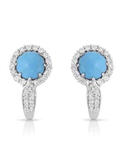 One 14KT White Gold 1.96ctw Turquoise and Diamond Earrings. (2) Turquoise stones with a total weight of 1.96cts. (54) Round Diamonds with a total weight of 0.58cts with a color of I and clarity of I-1. Total weight of these earrings are 4.66 grams.