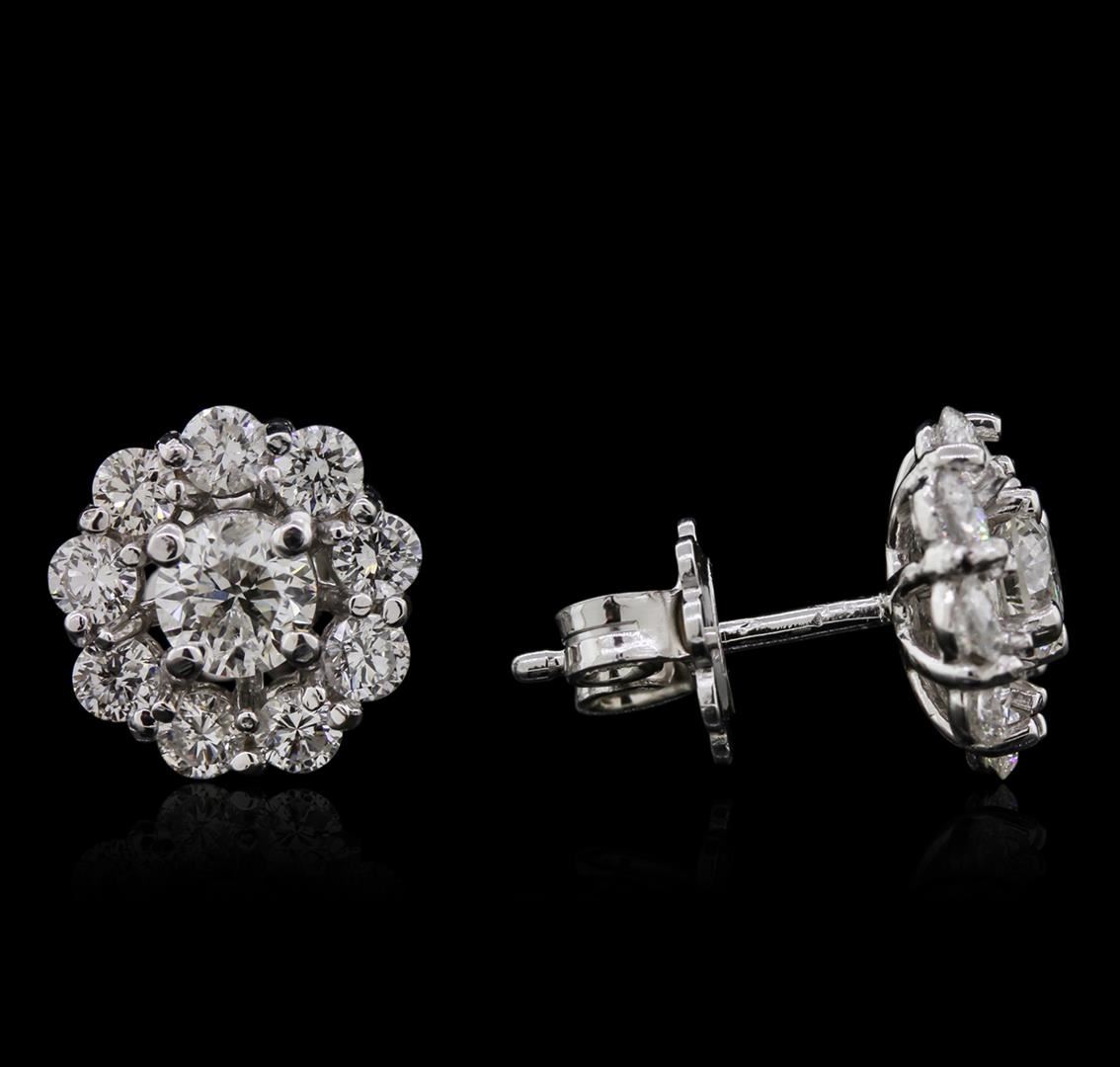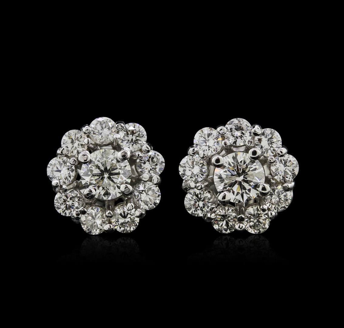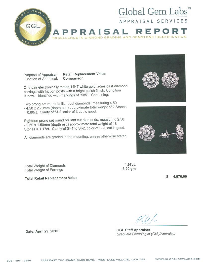 One pair electronically tested 14KT white gold ladies cast diamond earrings with friction posts with a bright polish finish. Identified with markings of "585". Condition is new. Containing: Two prong set round brilliant cut diamonds, measuring 4.50 - 4.50 x 2.70mm (depth est.) approximate total weight of 2 Stones = 0.80ct. Clarity: SI-2. Color: I, Cut is Good. Eighteen prong set round brilliant cut diamonds, measuring 2.50 - 2.50 x 1.50mm (depth est.) approximate total weight of 18 Stones = 1.17ct. Clarity: SI-1 to SI-2. Color: I - J, Cut is Good. All diamonds are graded in the mounting, unless otherwise stated. Total Weight of Diamonds 1.97ct. Total Weight of Earrings 3.20 grams. GGL Appraised at $4,970.00.