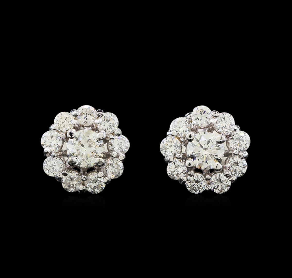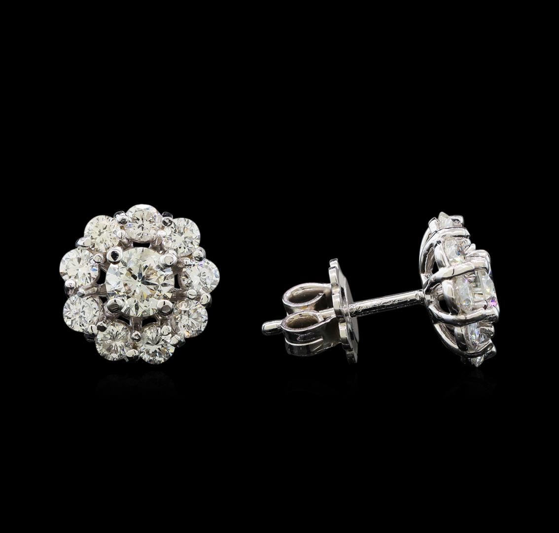 One pair electronically tested 14KT white gold ladies cast diamond earrings with friction posts with a bright polish finish. Identified with markings of "585". Condition is new. Containing: Two prong set round brilliant cut diamonds, measuring 4.50 - 4.50 x 2.70mm (depth est.) approximate total weight of 2 Stones = 0.80ct. Clarity: SI-2. Color: I, Cut is Good. Eighteen prong set round brilliant cut diamonds, measuring 2.50 - 2.50 x 1.50mm (depth est.) approximate total weight of 18 Stones = 1.17ct. Clarity: SI-1 to SI-2. Color: I - J, Cut is Good. All diamonds are graded in the mounting, unless otherwise stated. Total Weight of Diamonds 1.97ct. Total Weight of Earrings 3.20 grams. GGL Appraised at $4,970.00.