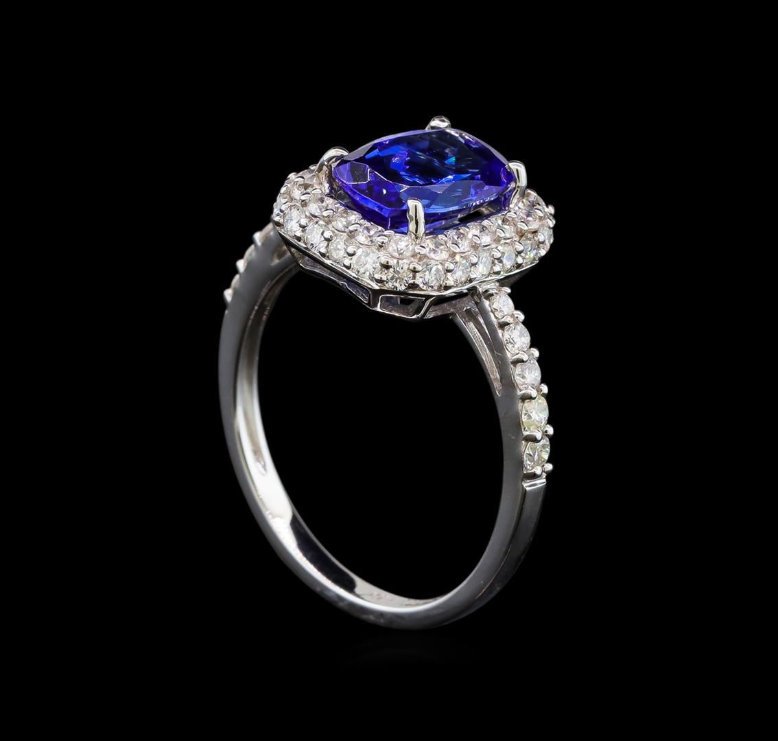 One electronically tested 14KT white gold ladies cast tanzanite and diamond ring with a flat shank with a bright polish finish. Trademark is Orianne. Identified with markings of "14K". Condition is new. Containing: One prong set rectangular cushion modified brilliant cut natural tanzanite, measuring 9.32 x 6.39 x 4.20mm, approximate weight of 1.97ct., clarity is eye clean, type I, medium light, very slightly grayish, violetish blue color, (GIA vB 4/3), cut is good. Fifty-Four prong set round brilliant cut diamonds, measuring 1.60 - 1.50 x 0.93mm (depth est.) approximate total weight of 54 Stones = 0.73ct. Clarity: SI-2 to I-2. Color: I - J, Cut is Good. All diamonds and colored gemstones are graded in the mounting, unless otherwise stated. Colored gemstones are presumed to have been subjected to commonly used enhancement processes. Total Weight of Colored Stones 1.97ct. Total Weight of Diamonds 0.73ct. Total Weight of Ring 3.00 grams. GGL Appraised at $3,755.00.