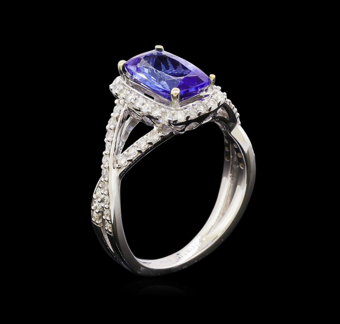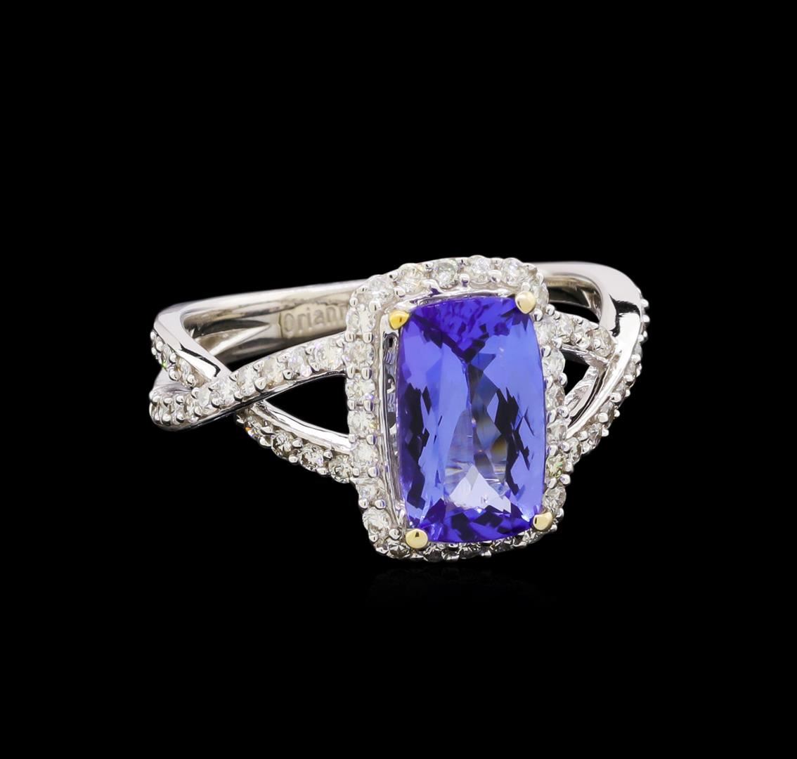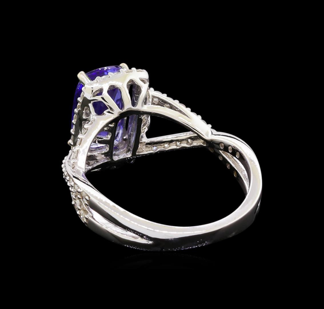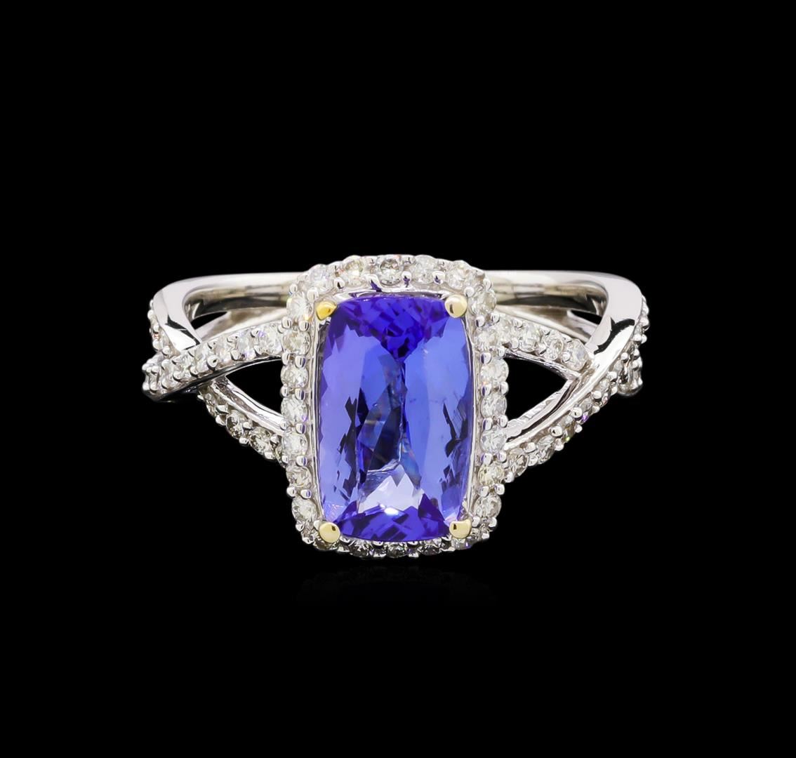One electronically tested 14KT white gold ladies combination cast & assembled tanzanite and diamond ring with a split shank with a bright polish finish. Identified with markings of "14K". Condition is new. Containing: One prong set rectangular cushion modified brilliant cut natural tanzanite, measuring 10.21 x 6.14 x 3.99mm, approximate weight of 1.97ct., clarity is eye clean, type I, medium light, very slightly grayish, violet color, (GIA V 4/3), cut is good. Fifty-Six prong set round brilliant cut diamonds, measuring 1.30 - 1.30 x 0.78mm (depth est.) approximate total weight of 56 Stones = 0.45ct. Clarity: SI-2 to I-2. Color: I - J, Cut is Good. All colored gemstones are graded in the mounting, unless otherwise stated. All diamonds and colored gemstones are graded in the mounting, unless otherwise stated. Total Weight of Colored Stones 1.97ct. Total Weight of Diamonds 0.45ct. Total Weight of Ring 4.20 grams. GGL Appraised at $5,165.00.