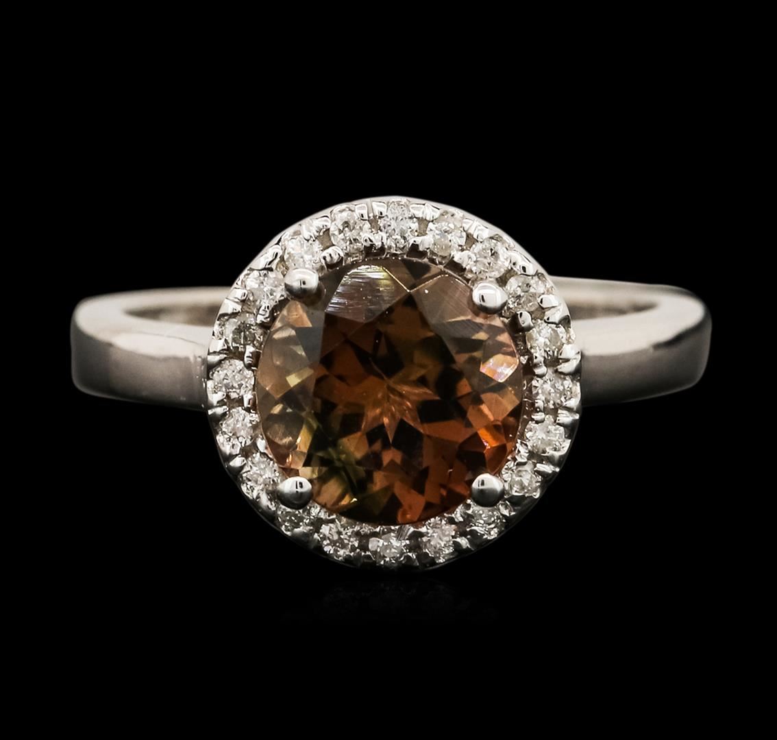 One electronically tested 14KT white gold ladies cast brown tourmaline and diamond ring with a bright polish finish. The featured brown tourmaline is set within a diamond bezel, completed by a two millimeter wide band. Identified with markings of "14K". Condition is new, good workmanship. Containing: One prong set round brilliant cut natural brown tourmaline, measuring 7.95 - 7.90 x 4.80 mm, 6% bulge factor, approximate weight of 1.97ct., clarity is eye clean, medium dark, moderately strong, brown color, (GIA Br 6/4), cut is good. Transmitting light with no distortion, transparent. Refractive index testing results of 1.62 to 1.64. This is a conclusive result for tourmaline. Graded in the setting. Twenty prong set round brilliant cut diamonds, measuring 1.30 - 1.20 x 0.75mm (depth est.) approximate total weight of 20 Stones = 0.24ct. Graded in the setting. Clarity: I-1 to I-2. Color: G - I. Total Weight of Colored Stones 1.97ct. Total Weight of Diamonds 0.24ct. Total Weight of Ring 4.05 grams. AIG Appraised at $1,535.00.