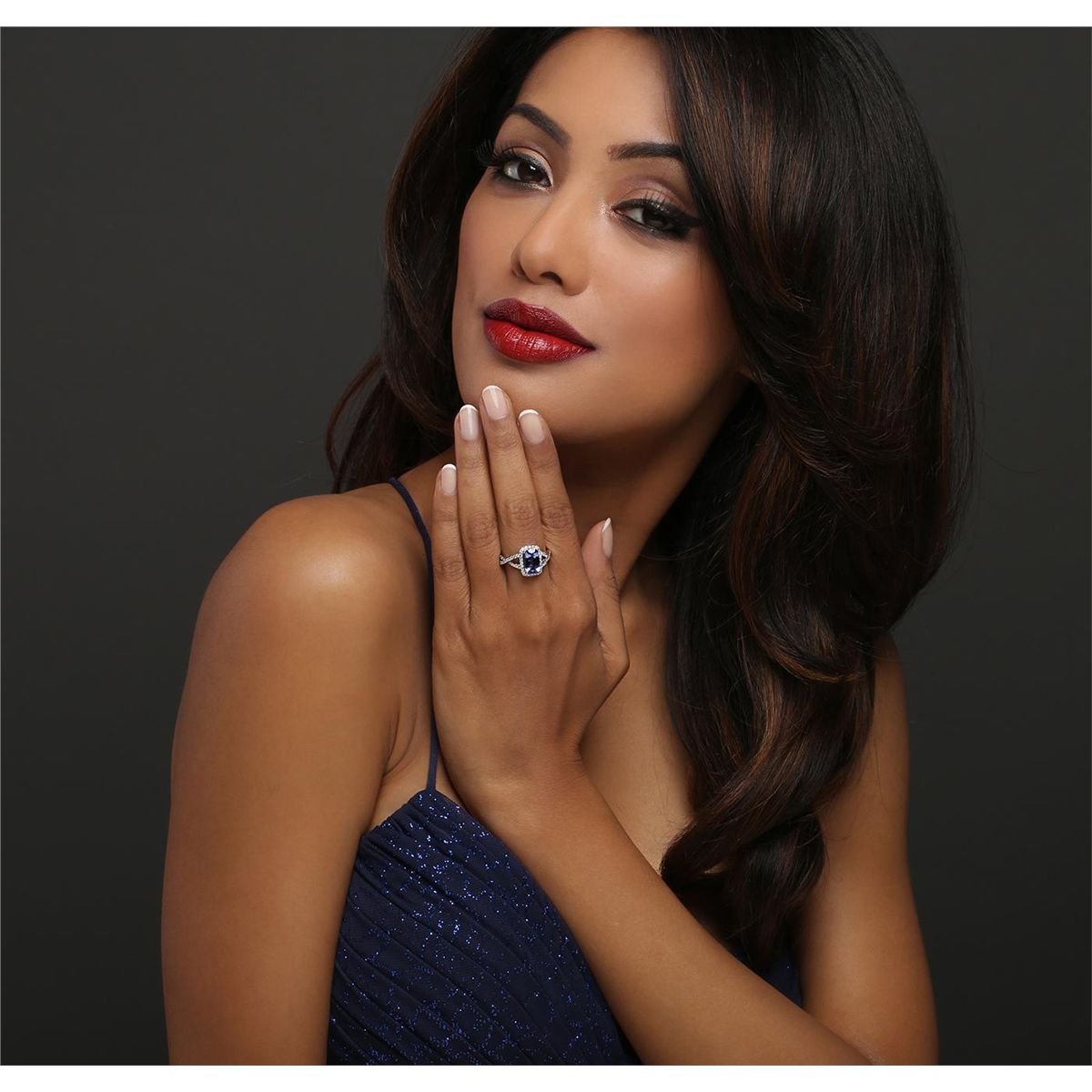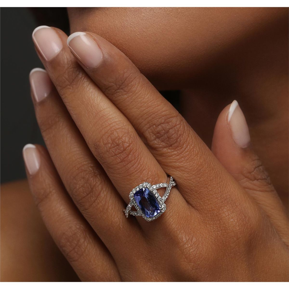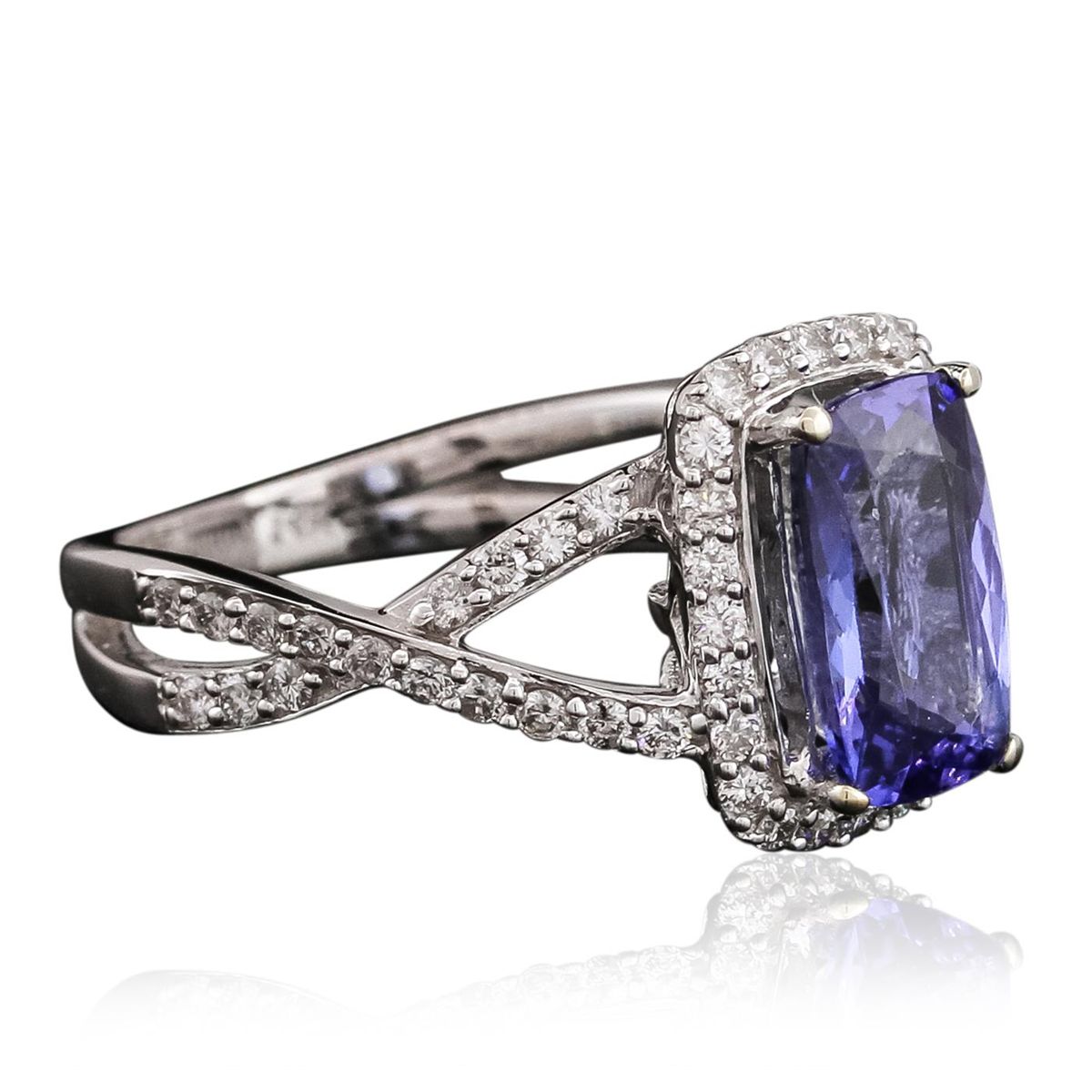 One electronically tested 14KT white gold ladies combination cast & assembled tanzanite and diamond ring with a split shank with a bright polish finish. Identified with markings of "14K". Condition is new. Containing: One prong set rectangular cushion modified brilliant cut natural tanzanite, measuring 10.21 x 6.14 x 3.99mm, approximate weight of 1.97ct., clarity is eye clean, type I, medium light, very slightly grayish, violet color, (GIA V 4/3), cut is good. Fifty-Six prong set round brilliant cut diamonds, measuring 1.30 - 1.30 x 0.78mm (depth est.) approximate total weight of 56 Stones = 0.45ct. Clarity: SI-2 to I-2. Color: I - J, Cut is Good. All colored gemstones are graded in the mounting, unless otherwise stated. All diamonds and colored gemstones are graded in the mounting, unless otherwise stated. Total Weight of Colored Stones 1.97ct. Total Weight of Diamonds 0.45ct. Total Weight of Ring 4.20 grams. GGL Appraised at $5,165.00.