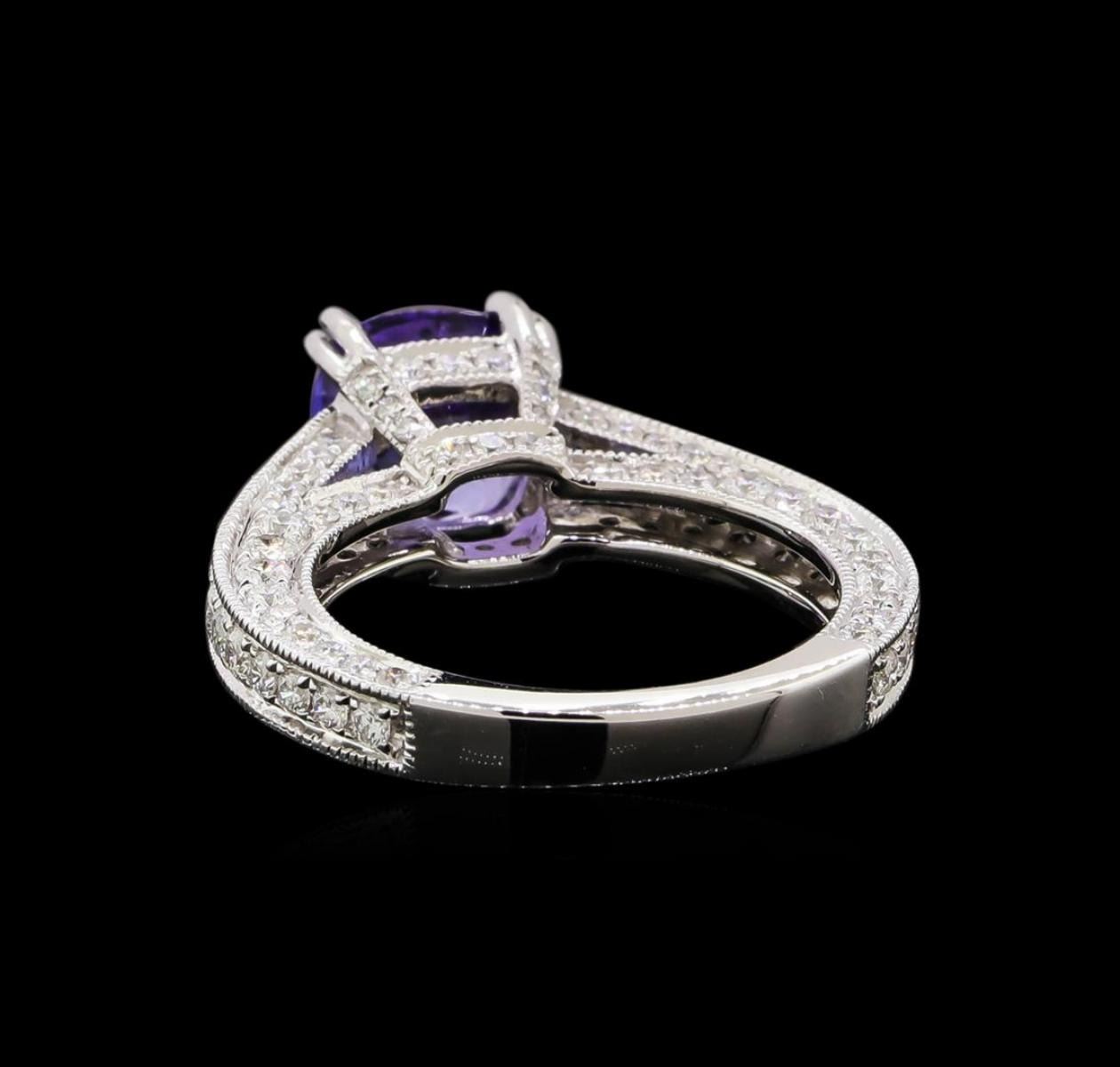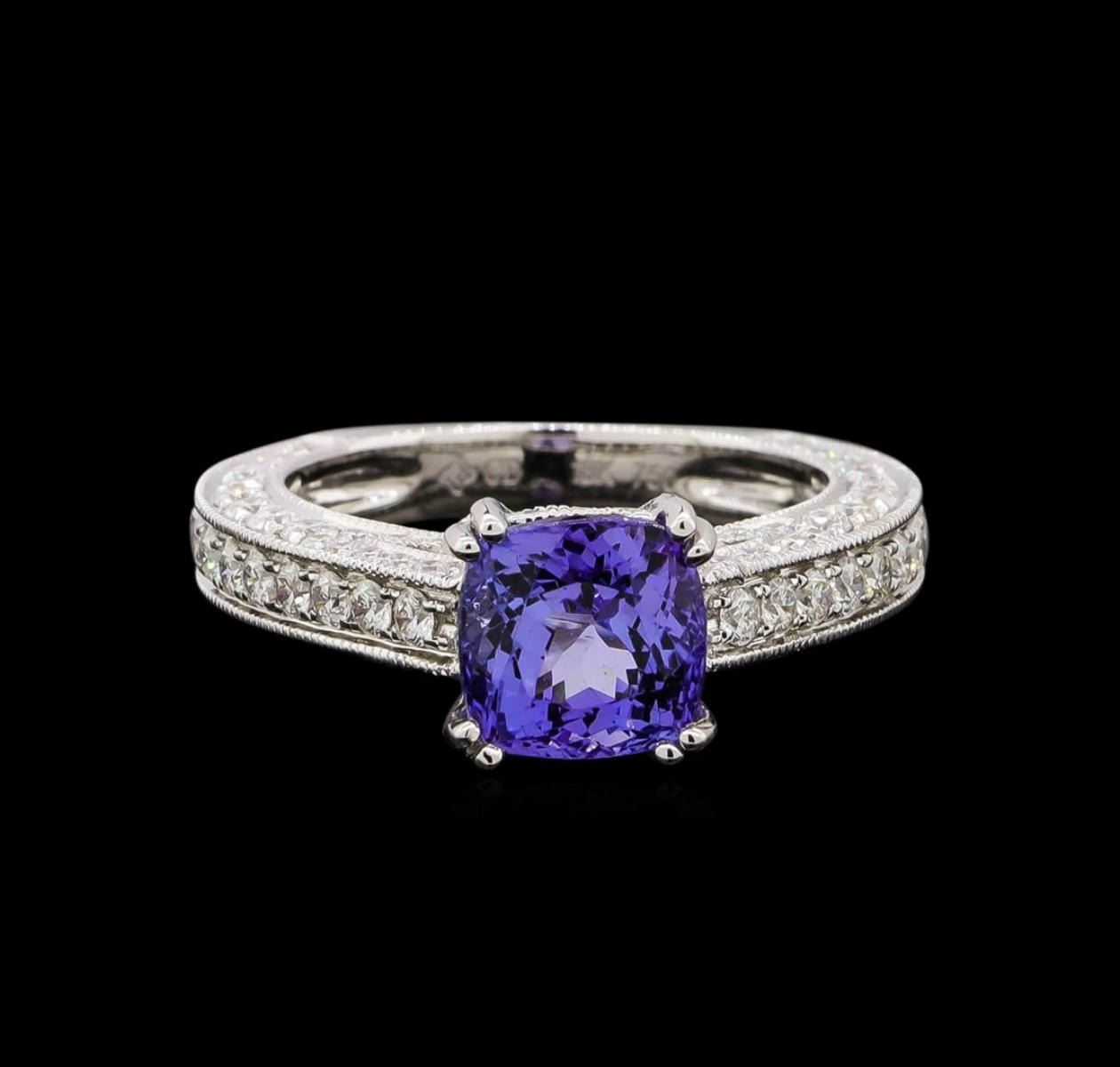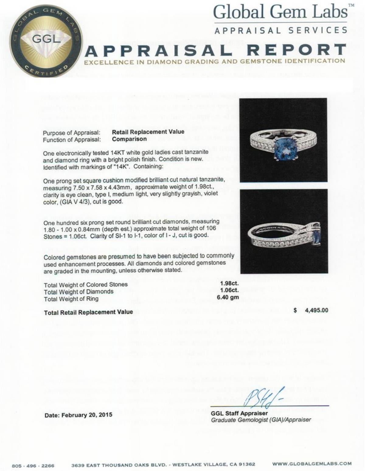 One electronically tested 14KT white gold ladies cast tanzanite and diamond ring with a bright polish finish. Identified with markings of "14K". Condition is new. Containing: One prong set square cushion modified brilliant cut natural tanzanite, measuring 7.50 x 7.58 x 4.43mm, approximate weight of 1.98ct., clarity is eye clean, type I, medium light, very slightly grayish, violet color, (GIA V 4/3), cut is good. One Hundred Six prong set round brilliant cut diamonds, measuring 1.80 - 1.00 x 0.84mm (depth est.) approximate total weight of 106 Stones = 1.06ct. Clarity: SI-1 to I-1. Color: I - J, Cut is Good. Colored gemstones are presumed to have been subjected to commonly used enhancement processes. All diamonds and colored gemstones are graded in the mounting, unless otherwise stated. Total Weight of Colored Stones 1.98ct. Total Weight of Diamonds 1.06ct. Total Weight of Ring 6.40 grams. GGL Appraised.