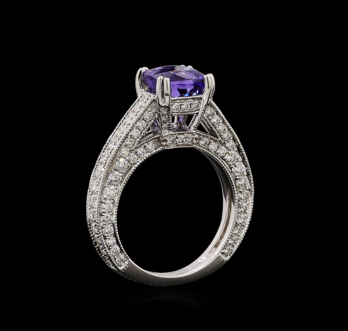 One electronically tested 14KT white gold ladies cast tanzanite and diamond ring with a bright polish finish. Identified with markings of "14K". Condition is new. Containing: One prong set square cushion modified brilliant cut natural tanzanite, measuring 7.50 x 7.58 x 4.43mm, approximate weight of 1.98ct., clarity is eye clean, type I, medium light, very slightly grayish, violet color, (GIA V 4/3), cut is good. One Hundred Six prong set round brilliant cut diamonds, measuring 1.80 - 1.00 x 0.84mm (depth est.) approximate total weight of 106 Stones = 1.06ct. Clarity: SI-1 to I-1. Color: I - J, Cut is Good. Colored gemstones are presumed to have been subjected to commonly used enhancement processes. All diamonds and colored gemstones are graded in the mounting, unless otherwise stated. Total Weight of Colored Stones 1.98ct. Total Weight of Diamonds 1.06ct. Total Weight of Ring 6.40 grams. GGL Appraised.