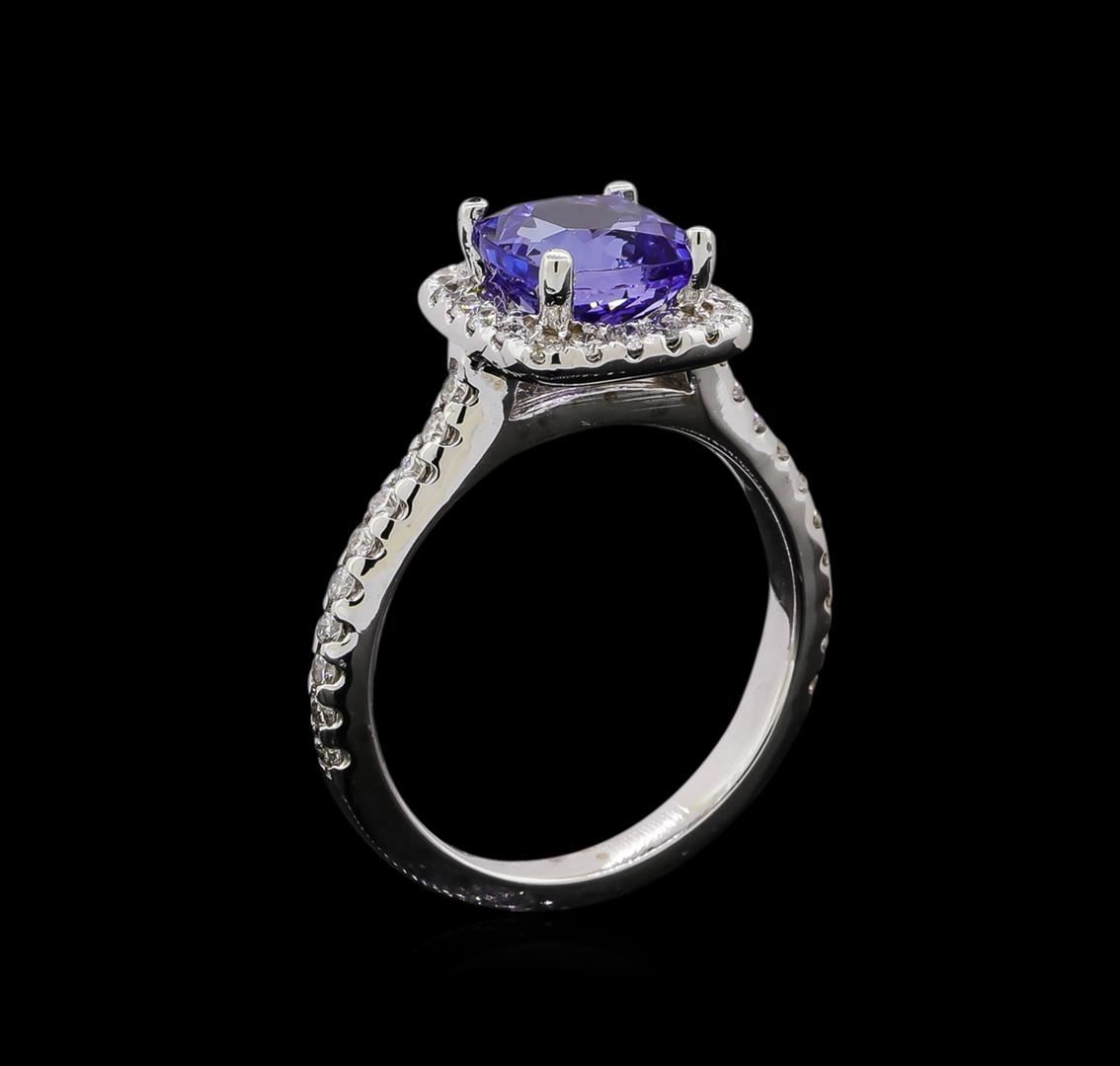 One electronically tested 14KT white gold ladies cast tanzanite and diamond ring with a bright polish finish. Identified with markings of "14K". Condition is new. Containing: One prong set square cushion modified brilliant cut natural tanzanite, measuring 7.30 x 7.30 x 4.75mm, approximate weight of 1.99ct., clarity is eye clean, type I, medium light, very slightly grayish, violet color, (GIA V 4/3), cut is good. Forty prong set round brilliant cut diamonds, measuring 1.50 - 1.50 x 0.90mm (depth est.) approximate total weight of 40 Stones = 0.49ct. Clarity: SI-1 to SI-2. Color: I - J, Cut is Good. Colored gemstones are presumed to have been subjected to commonly used enhancement processes. All diamonds and colored gemstones are graded in the mounting, unless otherwise stated. Total Weight of Colored Stones 1.99ct. Total Weight of Diamonds 0.49ct. Total Weight of Ring 4.30 grams. GGL Appraised at $3,060.00.