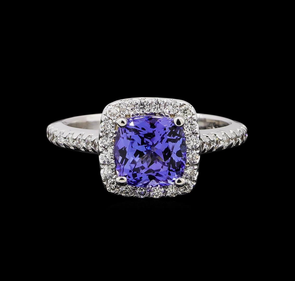 One electronically tested 14KT white gold ladies cast tanzanite and diamond ring with a bright polish finish. Identified with markings of "14K". Condition is new. Containing: One prong set square cushion modified brilliant cut natural tanzanite, measuring 7.30 x 7.30 x 4.75mm, approximate weight of 1.99ct., clarity is eye clean, type I, medium light, very slightly grayish, violet color, (GIA V 4/3), cut is good. Forty prong set round brilliant cut diamonds, measuring 1.50 - 1.50 x 0.90mm (depth est.) approximate total weight of 40 Stones = 0.49ct. Clarity: SI-1 to SI-2. Color: I - J, Cut is Good. Colored gemstones are presumed to have been subjected to commonly used enhancement processes. All diamonds and colored gemstones are graded in the mounting, unless otherwise stated. Total Weight of Colored Stones 1.99ct. Total Weight of Diamonds 0.49ct. Total Weight of Ring 4.30 grams. GGL Appraised at $3,060.00.