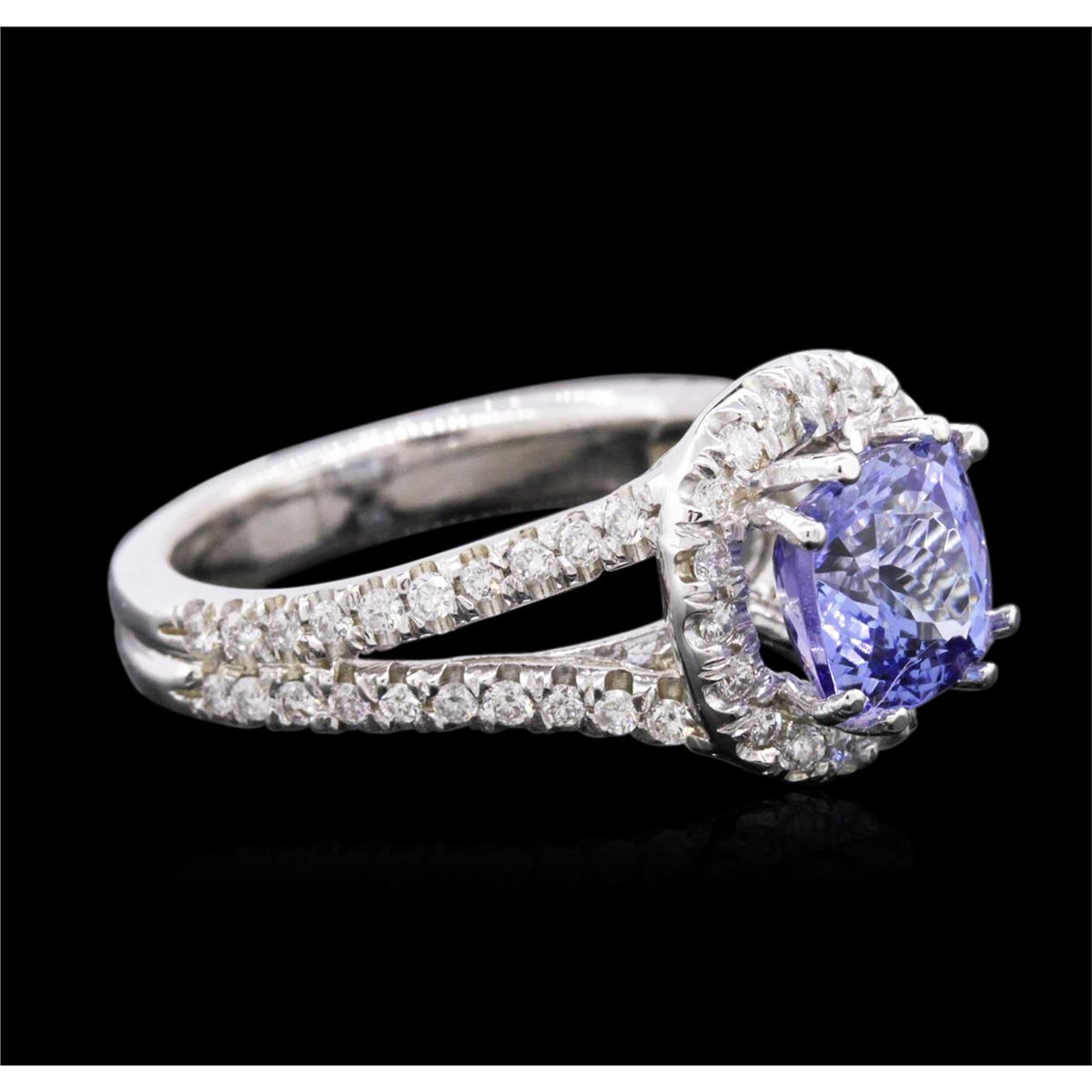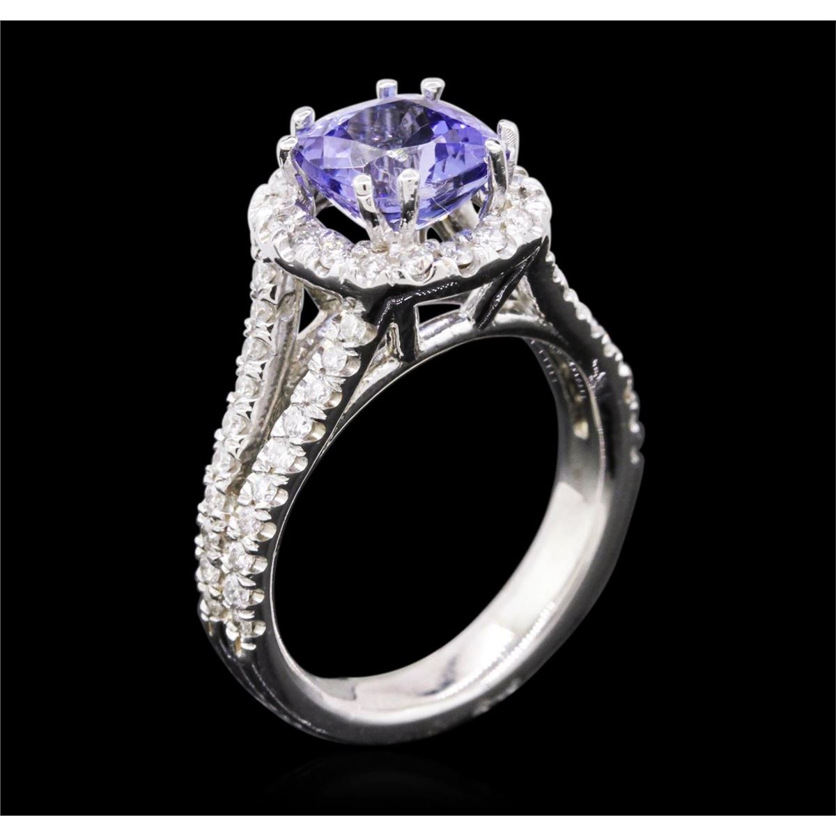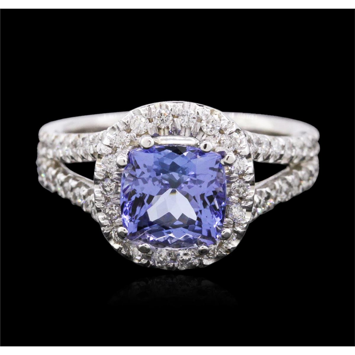One electronically tested 14KT white gold ladies cast tanzanite and diamond ring with a bright polish finish. Identified with markings of "14K". Condition is new. Containing: One prong set square cushion modified brilliant cut natural tanzanite, measuring 7.30 x 7.30 x 4.75mm, approximate weight of 1.99ct., clarity is eye clean, type I, medium light, very slightly grayish, violet color, (GIA V 4/3), cut is good. Fifty-Eight prong set round brilliant cut diamonds, measuring 1.30 - 1.30 x 0.78mm (depth est.) approximate total weight of 58 Stones = 0.46ct. Clarity: SI-1 to I-1. Color: I - J, Cut is Good. Colored gemstones are presumed to have been subjected to commonly used enhancement processes. All diamonds and colored gemstones are graded in the mounting, unless otherwise stated. Total Weight of Colored Stones 1.99ct. Total Weight of Diamonds 0.46ct. Total Weight of Ring 6.80 grams. GGL Appraised at $4,115.00.