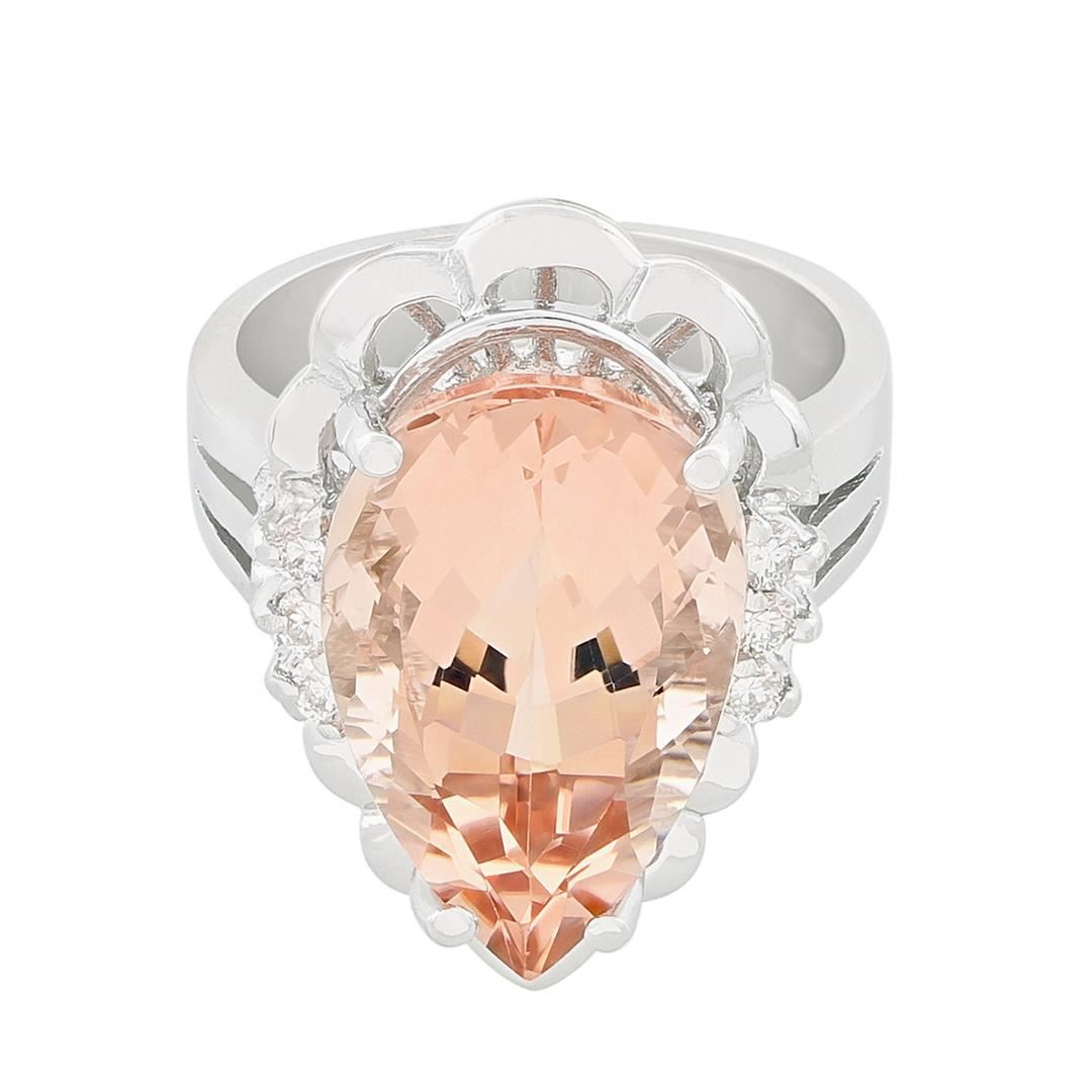 One electronically tested 14KT white gold ladies cast morganite and diamond ring with a bright polish finish. Identified with markings of "14K". Condition is new. Containing: One prong set pear modified brilliant cut natural morganite, measuring 17.90 x 12.00 x 8.50mm, approximate weight of 10.03ct., clarity is eye clean, type I, light, very slightly brownish, reddish orange color, (GIA rO 3/3), cut is very good. Morganite is commonly heated to improve or change the color. Whether or not this gemstone has been heated cannot currently be determined. Six prong set round brilliant cut diamonds, measuring 1.80 - 1.80 x 1.08mm (depth est.) approximate total weight of 6 Stones = 0.18ct. Clarity: SI-1. Color: H - I, Cut is Good. Colored gemstones are presumed to have been subjected to commonly used enhancement processes. All diamonds and colored gemstones are graded in the mounting, unless otherwise stated. Total Weight of Colored Stones 10.03ct. Total Weight of Diamonds 0.18ct. Total Weight of Ring 9.40 grams. GGL Appraised at $5,150.00.