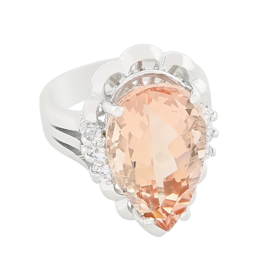 One electronically tested 14KT white gold ladies cast morganite and diamond ring with a bright polish finish. Identified with markings of "14K". Condition is new. Containing: One prong set pear modified brilliant cut natural morganite, measuring 17.90 x 12.00 x 8.50mm, approximate weight of 10.03ct., clarity is eye clean, type I, light, very slightly brownish, reddish orange color, (GIA rO 3/3), cut is very good. Morganite is commonly heated to improve or change the color. Whether or not this gemstone has been heated cannot currently be determined. Six prong set round brilliant cut diamonds, measuring 1.80 - 1.80 x 1.08mm (depth est.) approximate total weight of 6 Stones = 0.18ct. Clarity: SI-1. Color: H - I, Cut is Good. Colored gemstones are presumed to have been subjected to commonly used enhancement processes. All diamonds and colored gemstones are graded in the mounting, unless otherwise stated. Total Weight of Colored Stones 10.03ct. Total Weight of Diamonds 0.18ct. Total Weight of Ring 9.40 grams. GGL Appraised at $5,150.00.