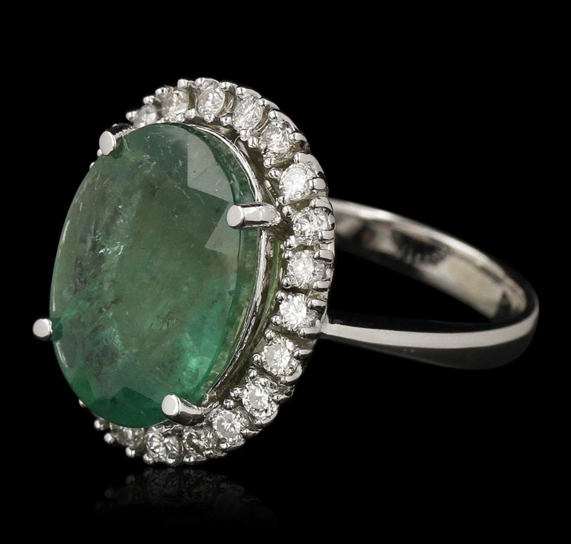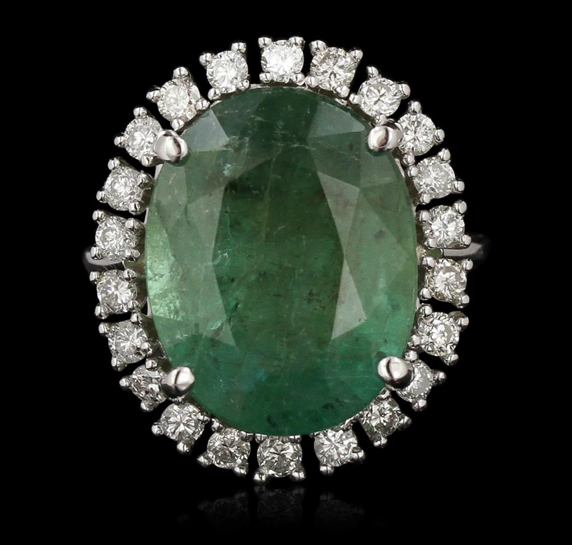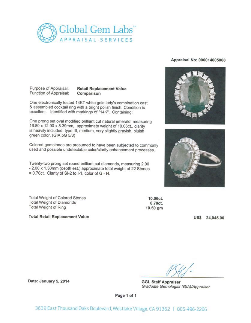 One electronically tested 14KT white gold lady's combination cast & assembled cocktail ring with a bright polish finish. Condition is excellent. Identified with markings of "14K". Containing: One prong set oval modified brilliant cut natural emerald, measuring 16.80 x 12.90 x 8.39mm, approximate weight of 10.06ct., clarity is heavily included, type III, medium, very slightly grayish, bluish green color, (GIA bG 5/3) Colored gemstones are presumed to have been subjected to commonly used and possible undetectable color/clarity enhancement processes. Twenty-two prong set round brilliant cut diamonds, measuring 2.00 - 2.00 x 1.30mm (depth est.) approximate total weight of 22 Stones = 0.70ct. Clarity of SI-2 to I-1, color of G - H. Total Weight of Colored Stones 10.06ct. Total Weight of Diamonds 0.70ct. Total Weight of Ring 10.50 grams. GGL appraised at $24,045.00. GGL Appraised at $24,045.00.