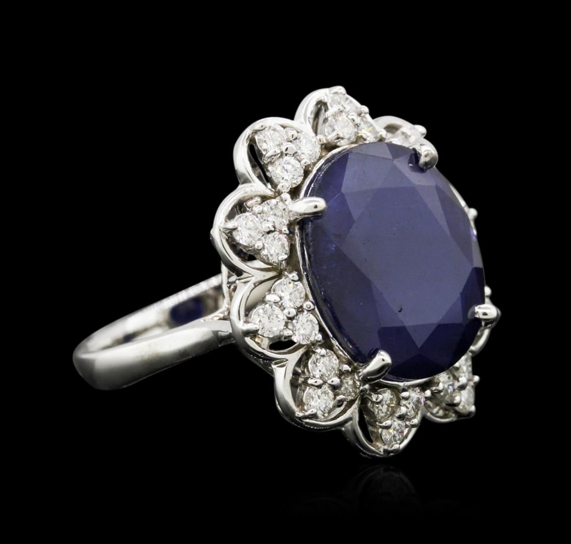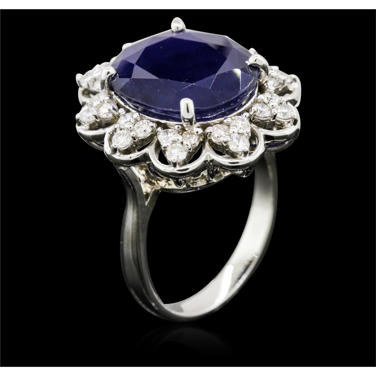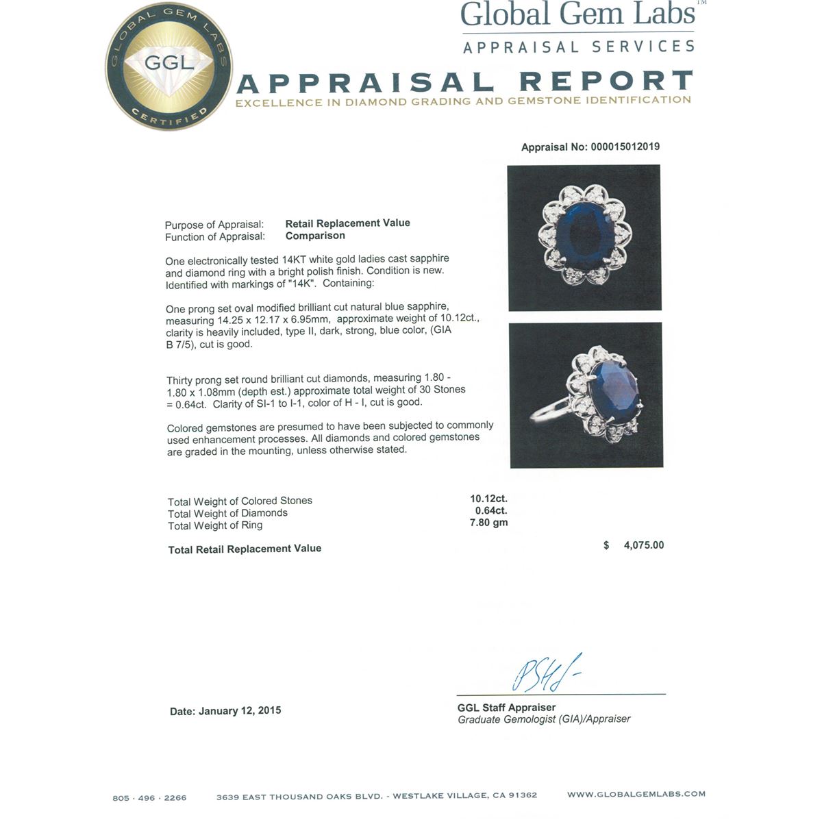 One electronically tested 14KT white gold ladies cast sapphire and diamond ring with a bright polish finish. Identified with markings of "14K". Condition is new. Containing: One prong set oval modified brilliant cut natural blue sapphire, measuring 14.25 x 12.17 x 6.95mm, approximate weight of 10.12ct., clarity is heavily included, type II, dark, strong, blue color, (GIA B 7/5), cut is good. Thirty prong set round brilliant cut diamonds, measuring 1.80 - 1.80 x 1.08mm (depth est.) approximate total weight of 30 Stones = 0.64ct. Clarity: SI-1 to I-1. Color: H - I, Cut is Good. Colored gemstones are presumed to have been subjected to commonly used enhancement processes. All diamonds and colored gemstones are graded in the mounting, unless otherwise stated. Total Weight of Colored Stones 10.12ct. Total Weight of Diamonds 0.64ct. Total Weight of Ring 7.80 grams. GGL Appraised at $4,075.00.