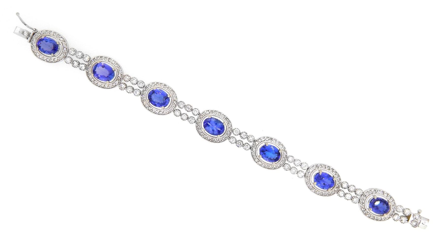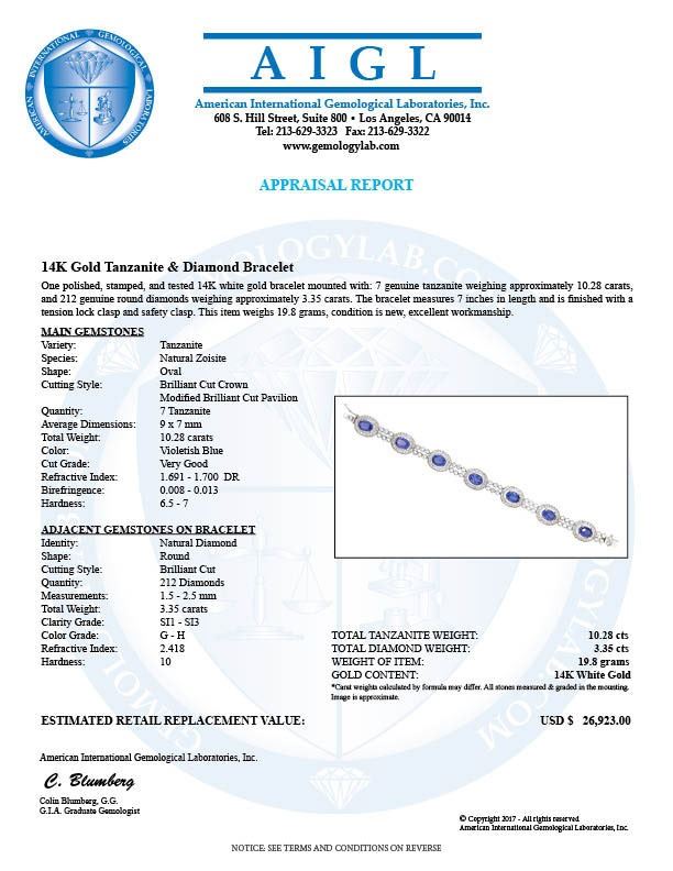 One 14KT White Gold 10.28ctw Tanzanite and Diamond Bracelet. (7) Tanzanite stones with a total weight of 10.28cts. (212) Diamonds with a total weight of 3.35cts with a color of H-H and clarity of SI-1 to SI-3. Total weight of this bracelet is 19.80 grams.