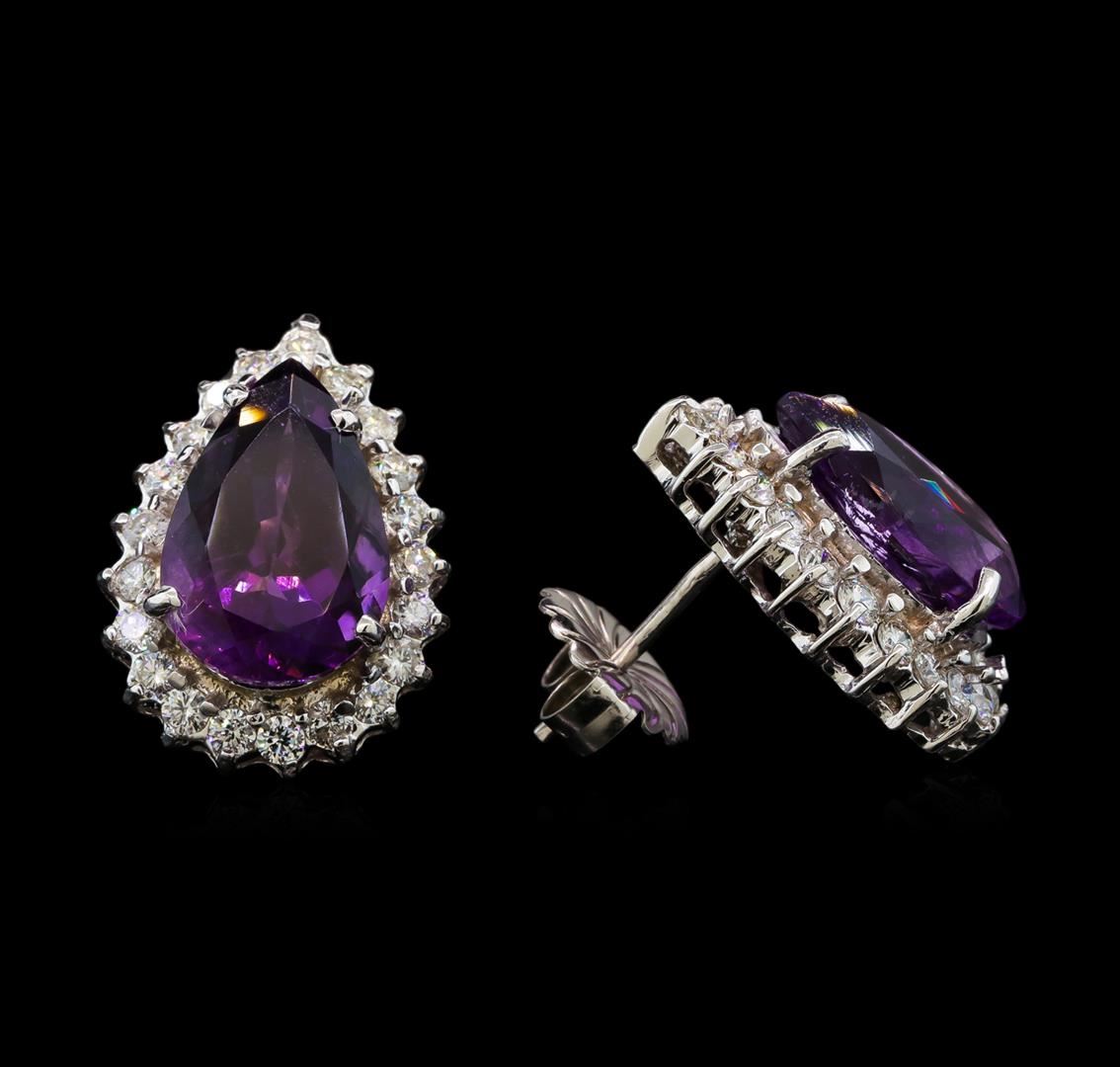One pair electronically tested 14KT white gold ladies cast amethyst and diamond earrings with friction posts with a bright polish finish. Identified with markings of "585". Condition is new. Containing: Two prong set pear modified brilliant cut natural amethysts, measuring 15.00 x 10.00 x 6.50mm, approximate total weight of 10.38ct., clarity is eye clean, type II, medium, moderately strong, purple color, (GIA P 5/4), cut is good. Forty-Four prong set round brilliant cut diamonds, measuring 2.00 - 2.00 x 1.20mm (depth est.) approximate total weight of 44 Stones = 1.29ct. Clarity: SI-2 to I-1. Color: I - J, Cut is Good. Total Weight of Colored Stones 10.38ct. Total Weight of Diamonds 1.29ct. Total Weight of Earrings 9.40 grams. GGL Appraised at $2,340.00.
