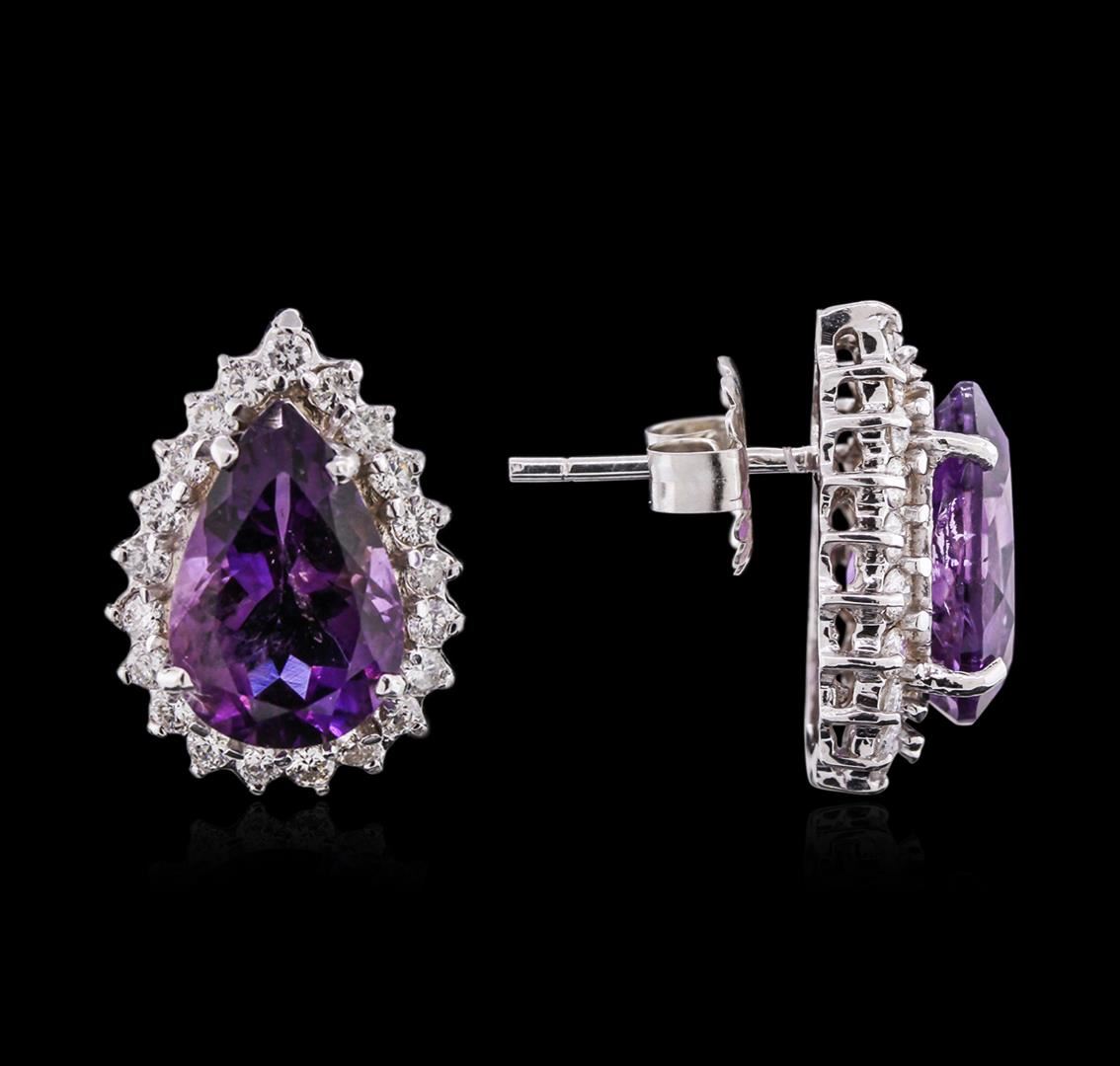 One pair electronically tested 14KT white gold ladies cast amethyst and diamond earrings with friction posts with a bright polish finish. Identified with markings of "585". Condition is new. Containing: Two prong set pear modified brilliant cut natural amethysts, measuring 15.00 x 10.00 x 6.50mm, approximate total weight of 10.38ct., clarity is eye clean, type II, medium, moderately strong, purple color, (GIA P 5/4), cut is good. Forty-Four prong set round brilliant cut diamonds, measuring 2.00 - 2.00 x 1.20mm (depth est.) approximate total weight of 44 Stones = 1.29ct. Clarity: SI-2 to I-1. Color: I - J, Cut is Good. Total Weight of Colored Stones 10.38ct. Total Weight of Diamonds 1.29ct. Total Weight of Earrings 9.40 grams. GGL Appraised at $2,340.00.