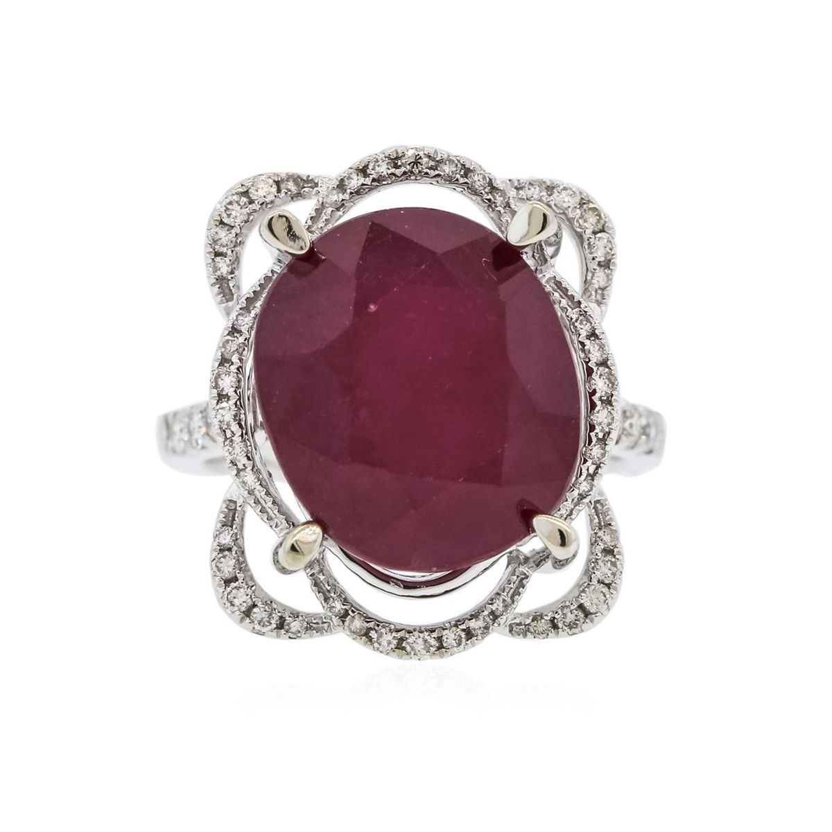 One electronically tested 14KT white gold ladies combination cast & assembled ring with a bright polish finish. Condition is new. Identified with markings of "14K". Containing: One prong set oval modified brilliant cut natural ruby, measuring 13.35 x 12.45 x 8.02mm, approximate weight of 10.68ct., clarity is heavily included, type II, medium, moderately strong, strongly purplish red color, (GIA stpR 5/4), cut is good. Ten prong set round brilliant cut diamonds, measuring 1.90 - 1.90 x 1.14mm (depth est.) approximate total weight of 10 Stones = 0.25ct. Clarity: SI-1. Color: I - J, Cut is Good. Forty-Six prong set round brilliant cut diamonds, measuring 1.00 - 1.00 x 0.60mm (depth est.) approximate total weight of 46 Stones = 0.17ct. Clarity: I-1 to I-2. Color: H - I, Cut is Good. Colored gemstones are presumed to have been subjected to commonly used enhancement processes. All diamonds and colored gemstones are graded in the mounting, unless otherwise stated. Total Weight of Colored Stones 10.68ct. Total Weight of Diamonds 0.42ct. Total Weight of Ring 8.30 grams. GGL Appraised at $9,225.00.