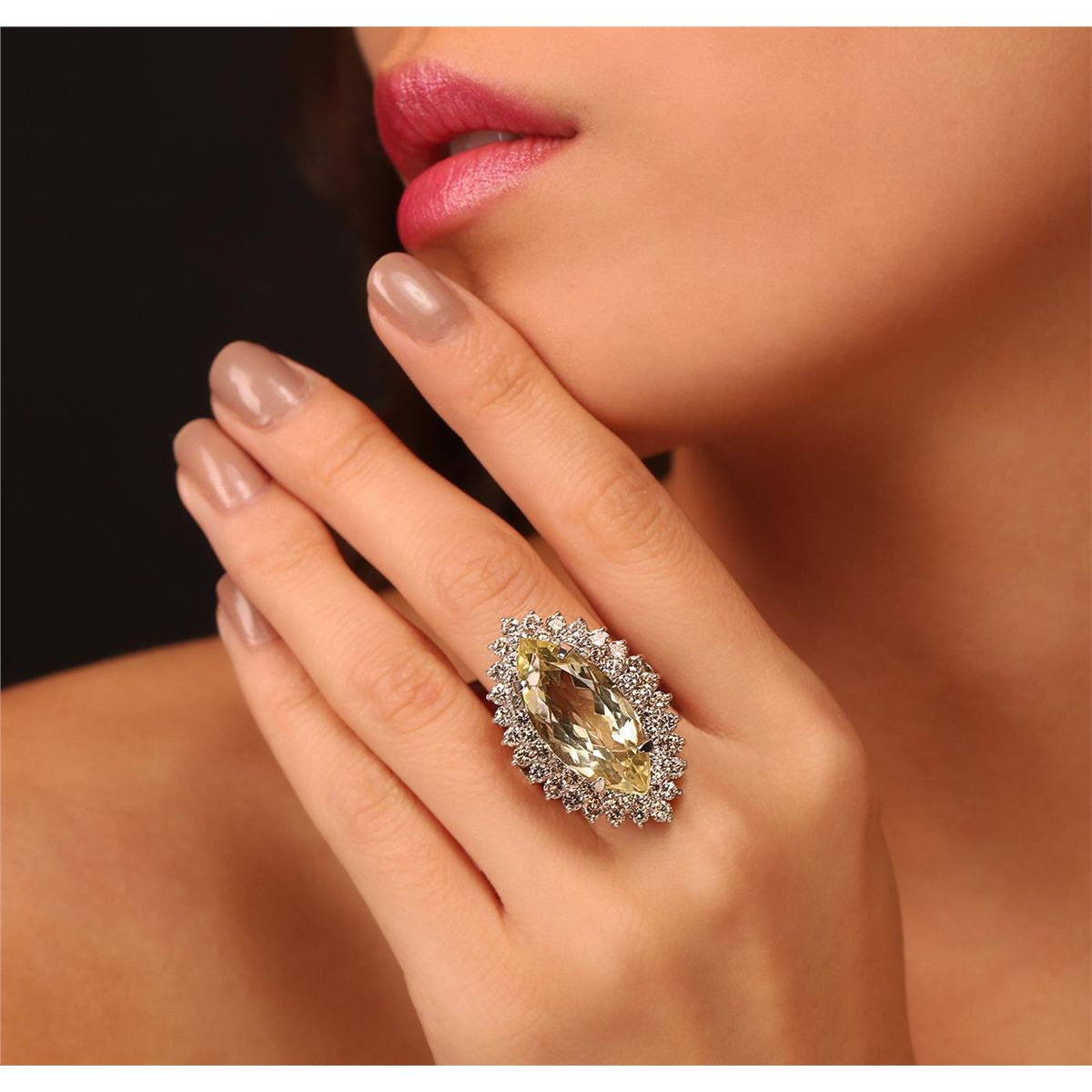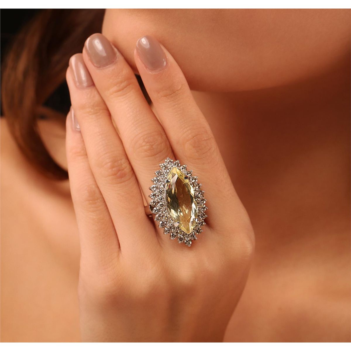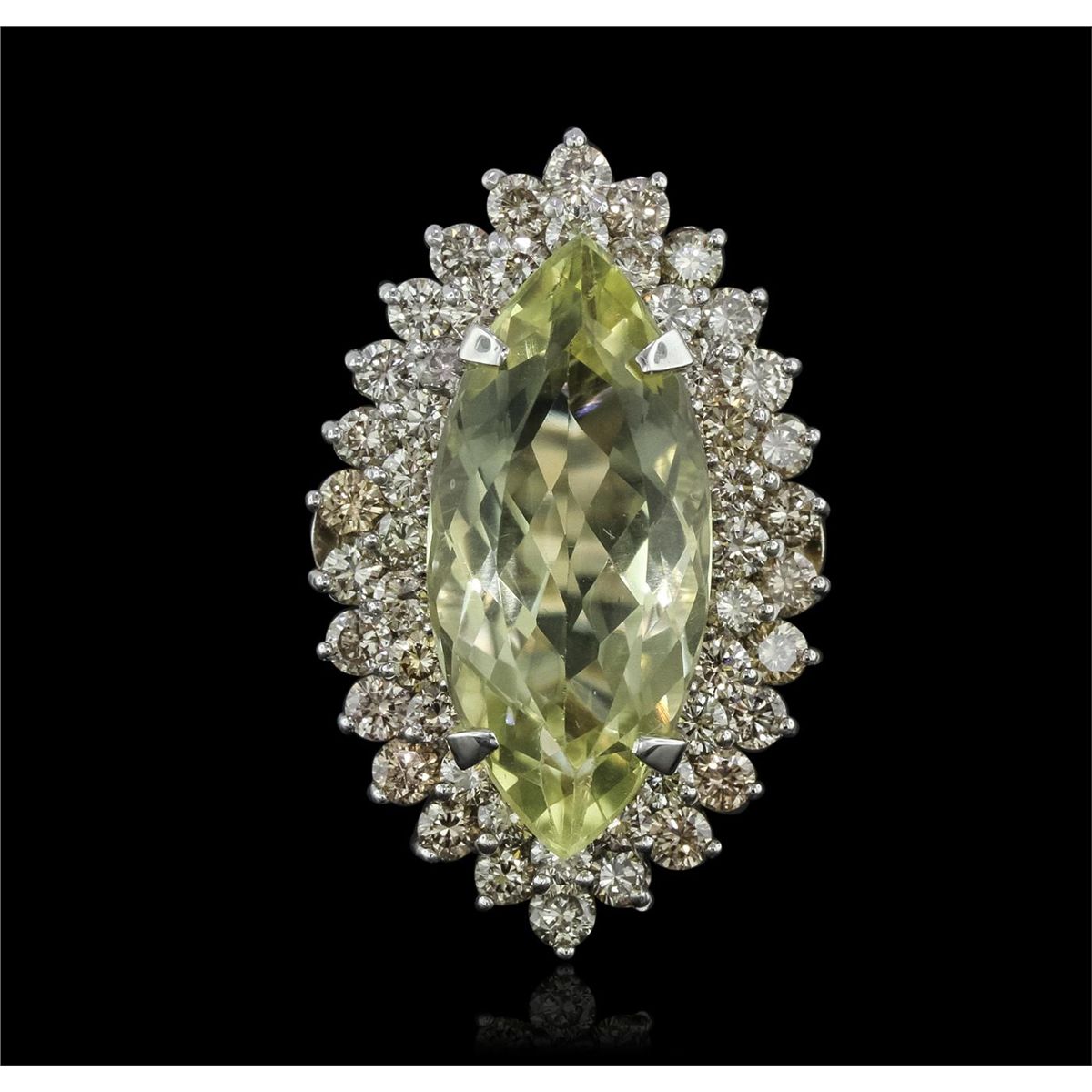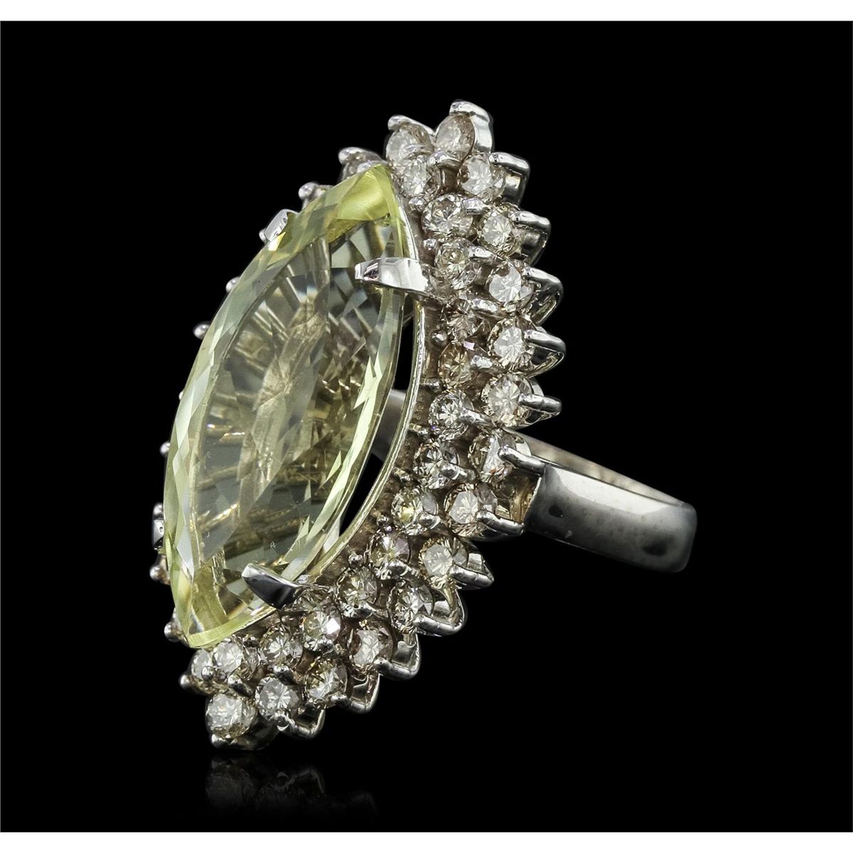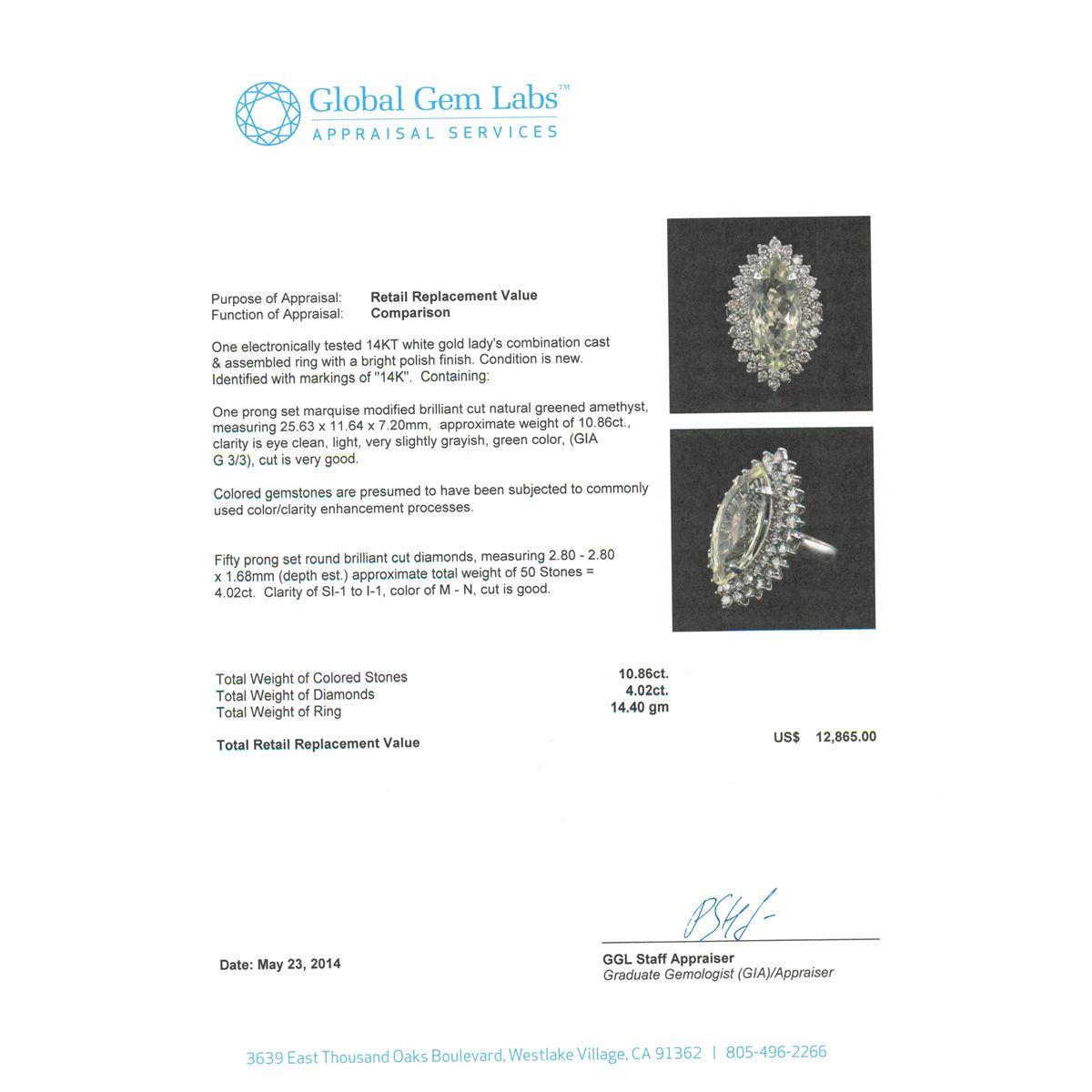 One electronically tested 14KT white gold Ladies combination cast & assembled ring with a bright polish finish. Condition is new. Identified with markings of "14K". Containing: One prong set marquise modified brilliant cut natural greened amethyst, measuring 25.63 x 11.64 x 7.20mm, approximate weight of 10.86ct., clarity is eye clean, light, very slightly grayish, green color, (GIA G 3/3), cut is very good. Colored gemstones are presumed to have been subjected to commonly used color/clarity enhancement processes. Fifty prong set round brilliant cut diamonds, measuring 2.80 - 2.80 x 1.68mm (depth est.) approximate. Total Weight of 50 Stones = 4.02ct. Clarity: SI-1 to I-1. Color: M - N, Cut is Good. Total Weight of Colored Stones 10.86ct. Total Weight of Diamonds 4.02ct. Total Weight of Ring 14.40 grams. GGL Appraised at $12,865.00.