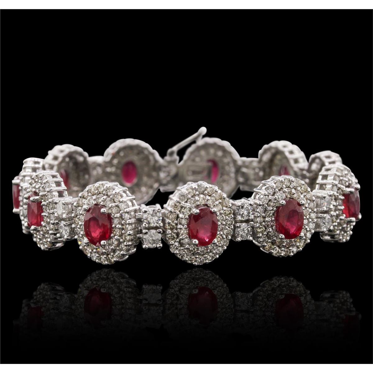 One electronically tested 14KT white gold ladies cast & assembled ruby and diamond bracelet with a bright polish finish. Condition is new, good workmanship. Seven inch length bracelet features a ribbon of ruby and diamond bezels, alternated by diamond duos, terminating in a concealed clasp with safety clasp. Identified with markings of "14K". Containing: Eleven prong set oval mixed cut natural rubies, measuring 7.00 x 5.00 x 3.25mm, 6%. bulge factor, approximate. Total Weight of 10.89ct., clarity is heavily included, type II, medium dark, moderately strong, slightly purplish red color, (GIA slpR 6/4), cut is good. Transmitting light somewhat diffusely, transparent to translucent. Naturally occurring internal & external characteristics are present. Indications of laboratory high temperature heat treatment, with glass & flux additives. Measurements & the color grade are an average for the group. Graded in the setting. Ruby has a low tolerance to rhodium plating, repolishing the surface, & ultrasonic cleaning. Twenty-Two prong set round brilliant cut diamonds, measuring 3.20 - 3.10 x 1.89mm (depth est.) approximate. Total Weight of 22 Stones = 2.61ct. Graded in the setting. Clarity: I-1 to I-3. Color: G - I Three Hundred Seventy-Four prong set round brilliant cut diamonds, measuring 1.80 - 1.60 x 1.02mm (depth est.) approximate. Total Weight of 374 Stones = 6.79ct. Graded in the setting. Clarity: SI-2 to I-2. Color: K - M. Total Weight of Colored Stones 10.89ct. Total Weight of Diamonds 9.40ct. Total Weight of Bracelet 38.10 grams. AIG Appraised at $25,300.00.