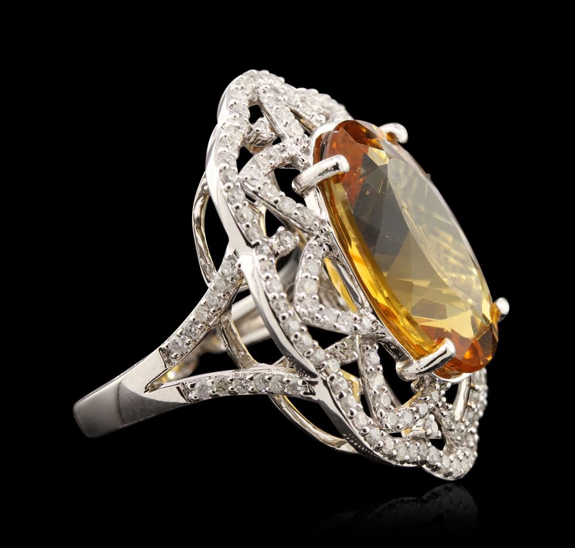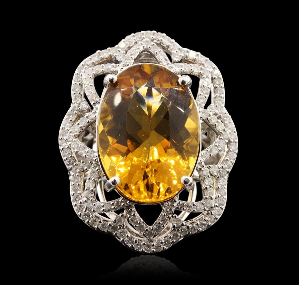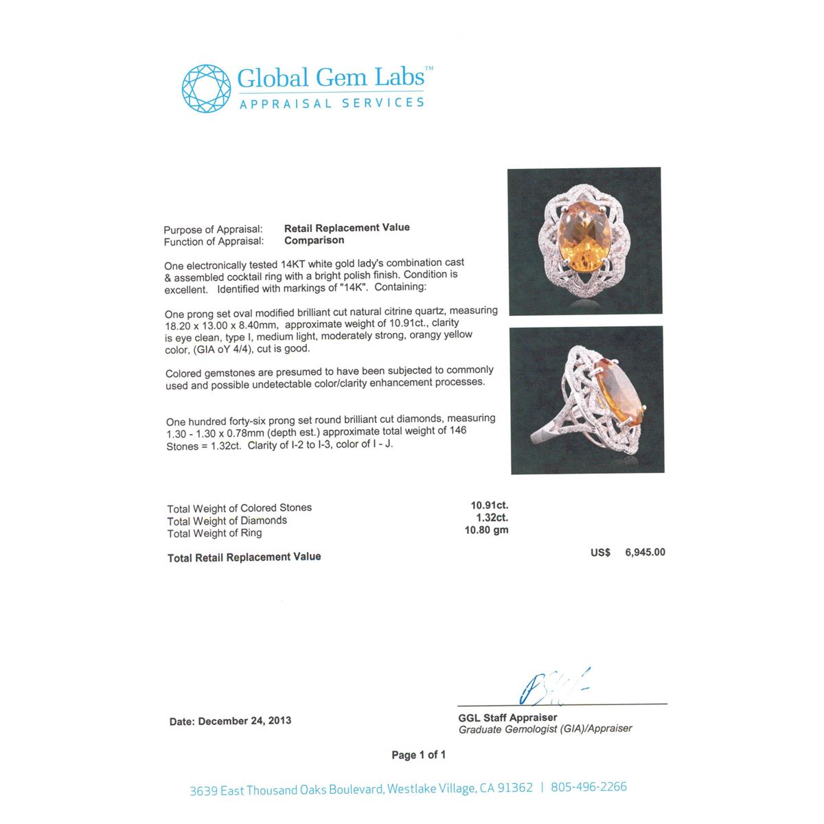 One electronically tested 14KT white gold Ladies combination cast & assembled cocktail ring with a bright polish finish. Identified with markings of "14K". Condition is excellent. Containing: One prong set oval modified brilliant cut natural citrine quartz, measuring 18.20 x 13.00 x 8.40mm, approximate weight of 10.91ct., clarity is eye clean, type I, medium light, moderately strong, orangy yellow color, (GIA oY 4/4), cut is good. Colored gemstones are presumed to have been subjected to commonly used and possible undetectable color/clarity enhancement processes. One Hundred Forty-Six prong set round brilliant cut diamonds, measuring 1.30 - 1.30 x 0.78mm (depth est.) approximate total weight of 146 Stones = 1.32ct. Clarity of I-2 to I-3, Color of I - J. Total Weight of Colored Stones 10.91ct. Total Weight of Diamonds 1.32ct. Total Weight of Ring 10.80gm. GGL Appraised at $6,945.00.