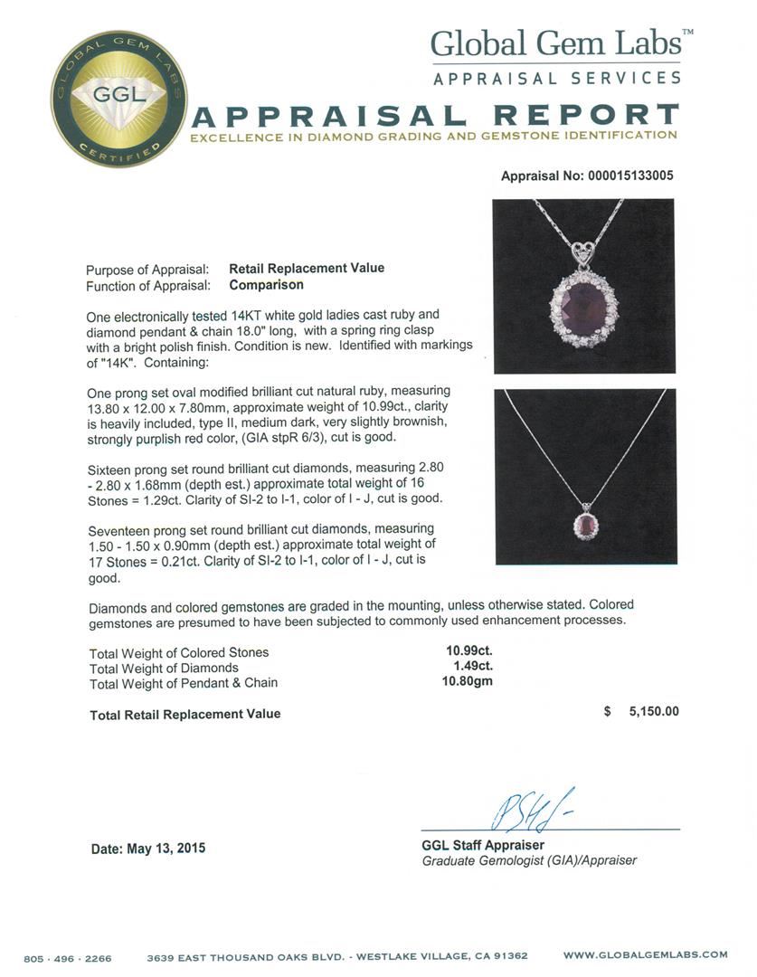 One electronically tested 14KT white gold ladies cast ruby and diamond pendant & chain 18.0" long, with a spring ring clasp with a bright polish finish. Identified with markings of "14K". Condition is new. Containing: One prong set oval modified brilliant cut natural ruby, measuring 13.80 x 12.00 x 7.80mm, approximate weight of 10.99ct., clarity is heavily included, type II, medium dark, very slightly brownish, strongly purplish red color, (GIA stpR 6/3), cut is good. Sixteen prong set round brilliant cut diamonds, measuring 2.80 - 2.80 x 1.68mm (depth est.) approximate total weight of 16 Stones = 1.29ct. Clarity: SI-2 to I-1. Color: I - J, Cut is Good. Seventeen prong set round brilliant cut diamonds, measuring 1.50 - 1.50 x 0.90mm (depth est.) approximate total weight of 17 Stones = 0.21ct. Clarity: SI-2 to I-1. Color: I - J, Cut is Good. Diamonds and colored gemstones are graded in the mounting, unless otherwise stated. Colored gemstones are presumed to have been subjected to commonly used enhancement processes. Total Weight of Colored Stones 10.99ct. Total Weight of Diamonds 1.49ct. Total Weight of Pendant & Chain 10.80 grams. GGL Appraised at $5,150.00.