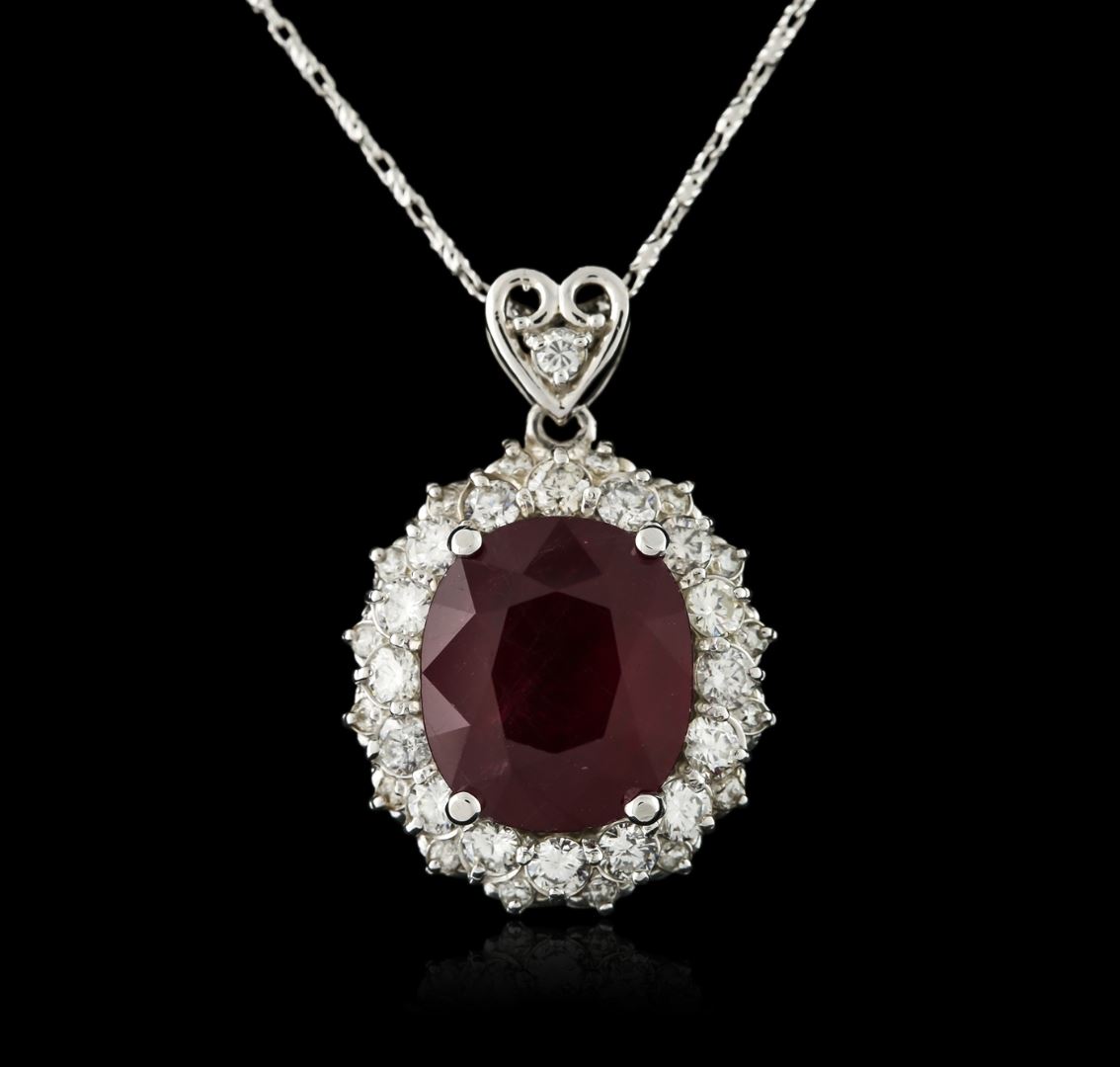 One electronically tested 14KT white gold ladies cast ruby and diamond pendant & chain 18.0" long, with a spring ring clasp with a bright polish finish. Identified with markings of "14K". Condition is new. Containing: One prong set oval modified brilliant cut natural ruby, measuring 13.80 x 12.00 x 7.80mm, approximate weight of 10.99ct., clarity is heavily included, type II, medium dark, very slightly brownish, strongly purplish red color, (GIA stpR 6/3), cut is good. Sixteen prong set round brilliant cut diamonds, measuring 2.80 - 2.80 x 1.68mm (depth est.) approximate total weight of 16 Stones = 1.29ct. Clarity: SI-2 to I-1. Color: I - J, Cut is Good. Seventeen prong set round brilliant cut diamonds, measuring 1.50 - 1.50 x 0.90mm (depth est.) approximate total weight of 17 Stones = 0.21ct. Clarity: SI-2 to I-1. Color: I - J, Cut is Good. Diamonds and colored gemstones are graded in the mounting, unless otherwise stated. Colored gemstones are presumed to have been subjected to commonly used enhancement processes. Total Weight of Colored Stones 10.99ct. Total Weight of Diamonds 1.49ct. Total Weight of Pendant & Chain 10.80 grams. GGL Appraised at $5,150.00.