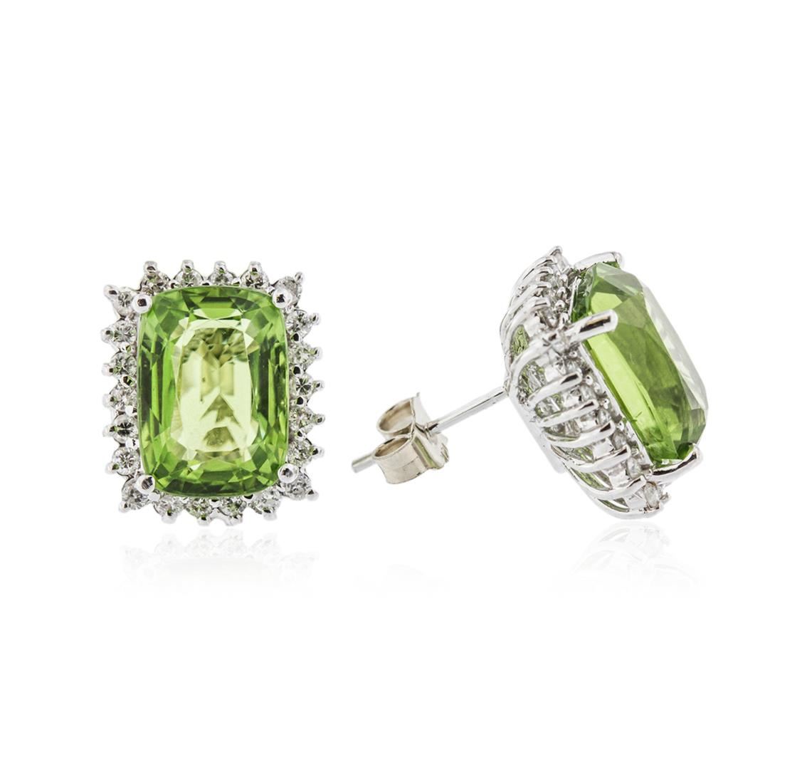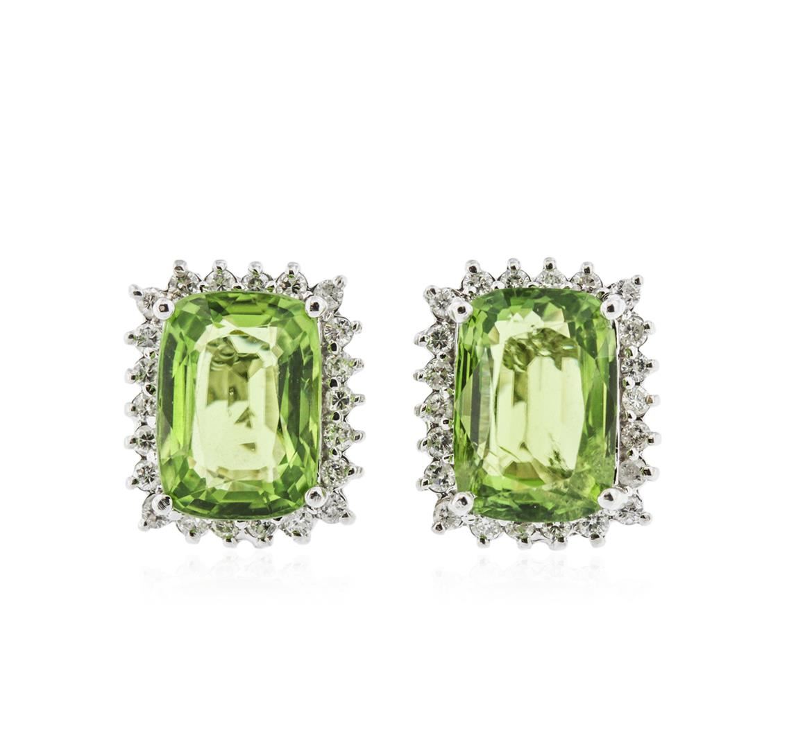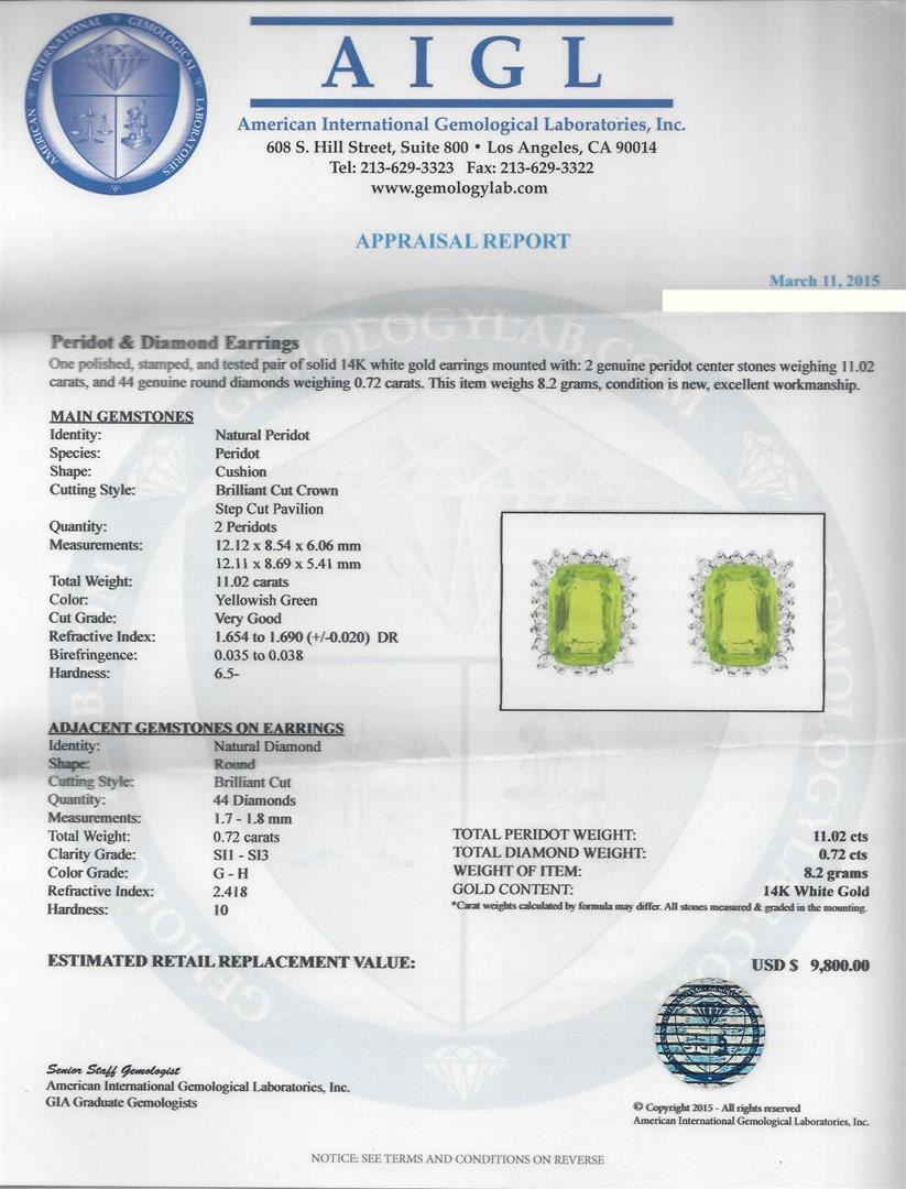 One polished, stamped, and tested pair of solid 14K white gold earrings mounted with: 2 genuine peridot center stones weighing 11.02 carats, and 44 genuine round diamonds weighing 0.72 carats. This item weighs 8.2 grams, condition is new, excellent workmanship. MAIN GEMSTONES: Identity: Natural Peridot. Species: Peridot. Shape: Cushion. Cutting Style: Brilliant Cut Crown Step Cut Pavilion. Quantity: 2 Peridots. Measurements: 12.12 x 8.54 x 6.06 mm 12.11 x 8.69 x 5.41 mm. Total Weight: 11.02 carats. Color: Yellowish Green. Cut Grade: Very Good. Refractive Index: 1.654 to 1.690 (+/-0.020) DR. Birefringence: 0.035 to 0.038. Hardness: 6.5-. ADJACENT GEMSTONES ON EARRINGS: Identity: Natural Diamond. Shape: Round. Cutting Style: Brilliant Cut. Quantity: 44 Diamonds. Measurements: 1.7 - 1.8 mm. Total Weight: 0.72 carats. Clarity Grade: SI1 - SI3. Color Grade: G - H. Refractive Index: 2.418. Hardness: 10. Total Peridot Weight: 11.02 cts. Total Diamond Weight: 0.72 cts. Weight of Item: 8.2 grams. Gold Content: 14K White Gold. AIGL Appraised at $9,800.00.