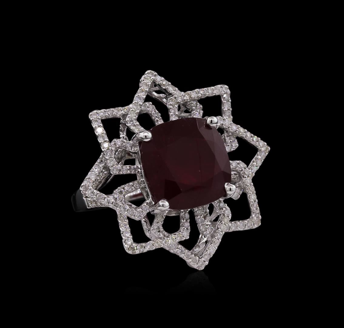 One electronically tested 14KT white gold Ladies combination cast & assembled cocktail ring with a bright polish finish. Identified with markings of "14K". Condition is excellent. Containing: One prong set square cushion modified brilliant cut natural ruby, measuring 12.10 x 12.10 x 7.40mm, approximate weight of 11.02ct., clarity is heavily included, type II, cut is good. Indications of heat treatment with glass and flux residue. Colored gemstones are presumed to have been subjected to commonly used and possible undetectable color/clarity enhancement processes. One Hundred Sixty prong set round brilliant cut diamonds, measuring 1.10 - 1.10 x 0.66mm (depth est.) approximate total weight of 160 Stones = 0.87ct. Clarity of I-1 to I-3, Color of H - I. Total Weight of Colored Stones 11.02ct. Total Weight of Diamonds 0.87ct. Total Weight of Ring 9.20gm. GGL Appraised at $8,355.00.