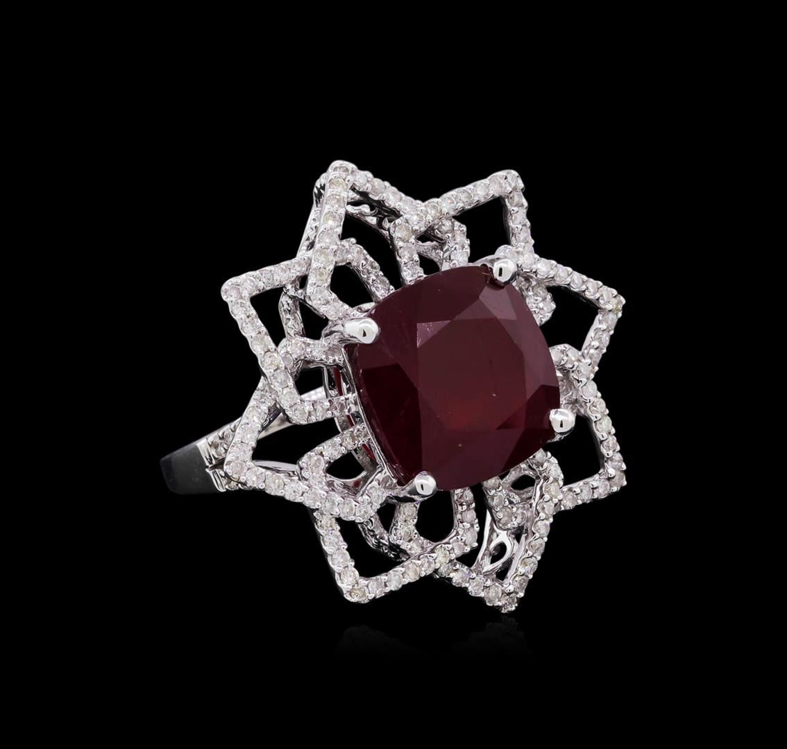 One electronically tested 14KT white gold Ladies combination cast & assembled cocktail ring with a bright polish finish. Identified with markings of "14K". Condition is excellent. Containing: One prong set square cushion modified brilliant cut natural ruby, measuring 12.10 x 12.10 x 7.40mm, approximate weight of 11.02ct., clarity is heavily included, type II, cut is good. Indications of heat treatment with glass and flux residue. Colored gemstones are presumed to have been subjected to commonly used and possible undetectable color/clarity enhancement processes. One Hundred Sixty prong set round brilliant cut diamonds, measuring 1.10 - 1.10 x 0.66mm (depth est.) approximate total weight of 160 Stones = 0.87ct. Clarity of I-1 to I-3, Color of H - I. Total Weight of Colored Stones 11.02ct. Total Weight of Diamonds 0.87ct. Total Weight of Ring 9.20gm. GGL Appraised at $8,355.00.