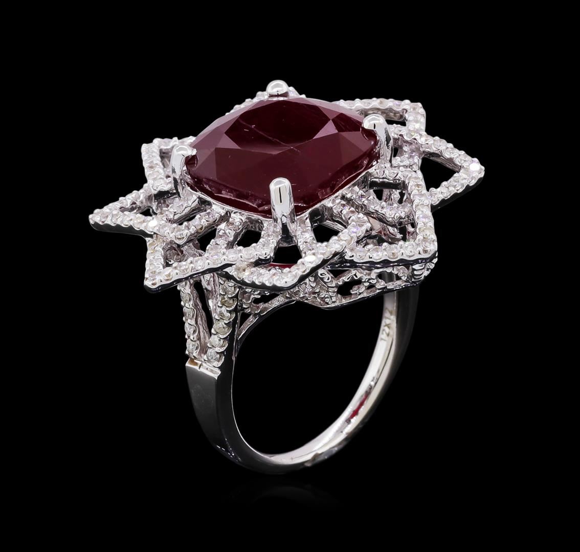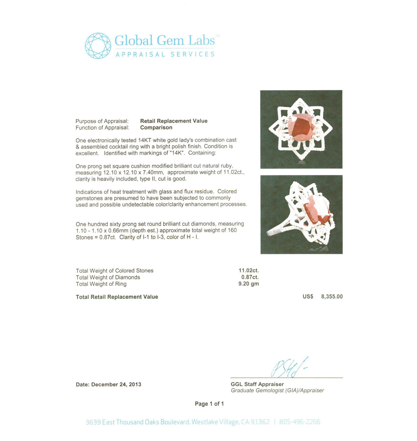 One electronically tested 14KT white gold Ladies combination cast & assembled cocktail ring with a bright polish finish. Identified with markings of "14K". Condition is excellent. Containing: One prong set square cushion modified brilliant cut natural ruby, measuring 12.10 x 12.10 x 7.40mm, approximate weight of 11.02ct., clarity is heavily included, type II, cut is good. Indications of heat treatment with glass and flux residue. Colored gemstones are presumed to have been subjected to commonly used and possible undetectable color/clarity enhancement processes. One Hundred Sixty prong set round brilliant cut diamonds, measuring 1.10 - 1.10 x 0.66mm (depth est.) approximate total weight of 160 Stones = 0.87ct. Clarity of I-1 to I-3, Color of H - I. Total Weight of Colored Stones 11.02ct. Total Weight of Diamonds 0.87ct. Total Weight of Ring 9.20gm. GGL Appraised at $8,355.00.