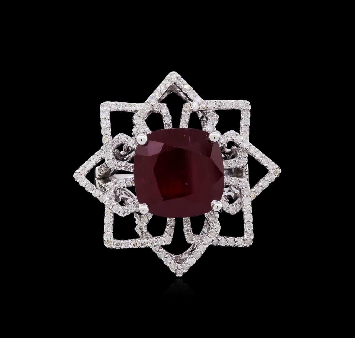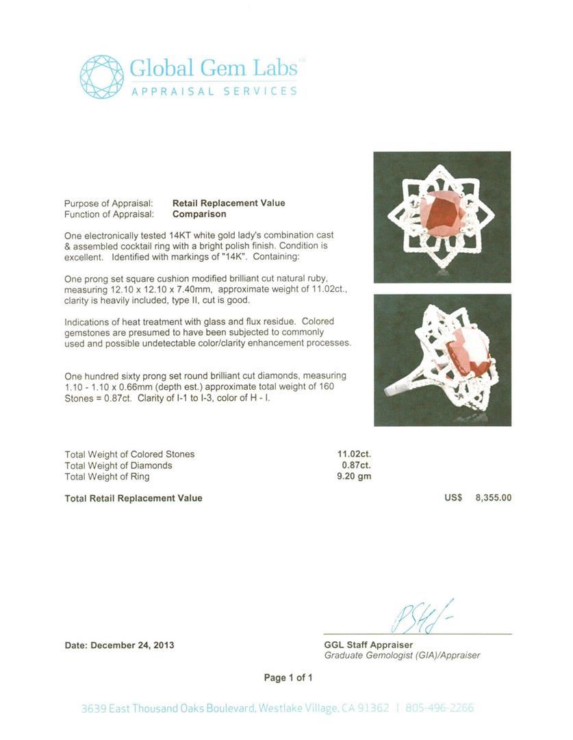One electronically tested 14KT white gold Ladies combination cast & assembled cocktail ring with a bright polish finish. Identified with markings of "14K". Condition is excellent. Containing: One prong set square cushion modified brilliant cut natural ruby, measuring 12.10 x 12.10 x 7.40mm, approximate weight of 11.02ct., clarity is heavily included, type II, cut is good. Indications of heat treatment with glass and flux residue. Colored gemstones are presumed to have been subjected to commonly used and possible undetectable color/clarity enhancement processes. One Hundred Sixty prong set round brilliant cut diamonds, measuring 1.10 - 1.10 x 0.66mm (depth est.) approximate total weight of 160 Stones = 0.87ct. Clarity of I-1 to I-3, Color of H - I. Total Weight of Colored Stones 11.02ct. Total Weight of Diamonds 0.87ct. Total Weight of Ring 9.20gm. GGL Appraised.
