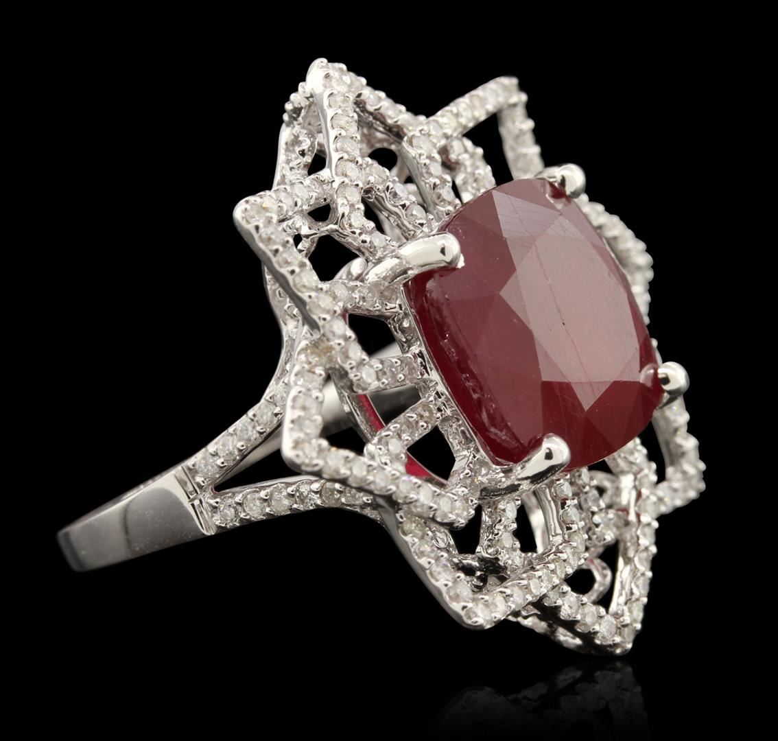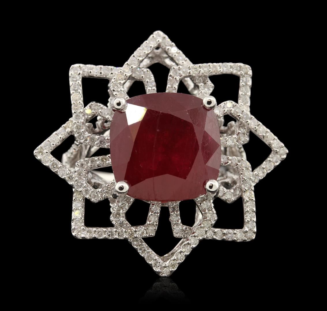 One electronically tested 14KT white gold Ladies combination cast & assembled cocktail ring with a bright polish finish. Identified with markings of "14K". Condition is excellent. Containing: One prong set square cushion modified brilliant cut natural ruby, measuring 12.10 x 12.10 x 7.40mm, approximate weight of 11.02ct., clarity is heavily included, type II, cut is good. Indications of heat treatment with glass and flux residue. Colored gemstones are presumed to have been subjected to commonly used and possible undetectable color/clarity enhancement processes. One Hundred Sixty prong set round brilliant cut diamonds, measuring 1.10 - 1.10 x 0.66mm (depth est.) approximate total weight of 160 Stones = 0.87ct. Clarity of I-1 to I-3, Color of H - I. Total Weight of Colored Stones 11.02ct. Total Weight of Diamonds 0.87ct. Total Weight of Ring 9.20gm. GGL Appraised at $8,355.00.
