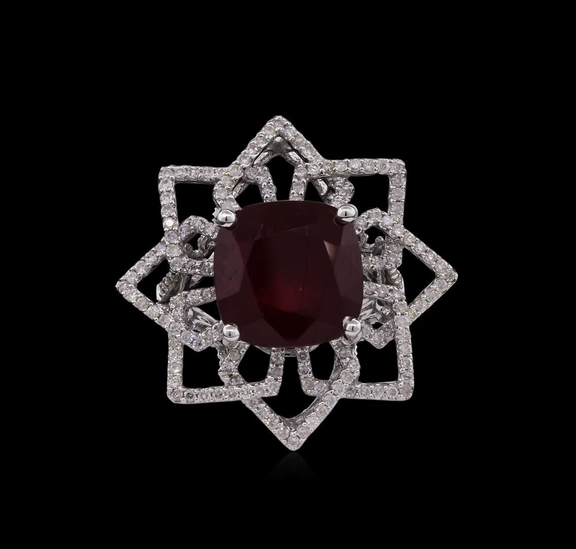 One electronically tested 14KT white gold Ladies combination cast & assembled cocktail ring with a bright polish finish. Identified with markings of "14K". Condition is excellent. Containing: One prong set square cushion modified brilliant cut natural ruby, measuring 12.10 x 12.10 x 7.40mm, approximate weight of 11.02ct., clarity is heavily included, type II, cut is good. Indications of heat treatment with glass and flux residue. Colored gemstones are presumed to have been subjected to commonly used and possible undetectable color/clarity enhancement processes. One Hundred Sixty prong set round brilliant cut diamonds, measuring 1.10 - 1.10 x 0.66mm (depth est.) approximate total weight of 160 Stones = 0.87ct. Clarity of I-1 to I-3, Color of H - I. Total Weight of Colored Stones 11.02ct. Total Weight of Diamonds 0.87ct. Total Weight of Ring 9.20gm. GGL Appraised at $8,355.00.